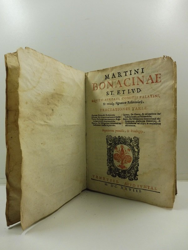 In 8, pp. (34) + 324. F. a due col. Stemma dei Giunta. P. pg. coeva con piccole manc. al d. ed ad un ang. Testo di diritto canonico non comune. Martino Bonacina (1585-1631), di nobile famiglia ambrosiana, fu accolto nel 1608 fra gli Oblati. Nel 1615 fu chiamato quale rettore presso il collegio dei nobili e piu' tardi passo' a dirigere il seminario elvetico. La sua imponente opera non si esauri' nel campo degli studi di teologia ma investi' anche alcuni problemi economico-sociali di piu' immediata rilevanza per il suo tempo. Cosi' Diz. Biografico degli Italiani,XI, p. 467.