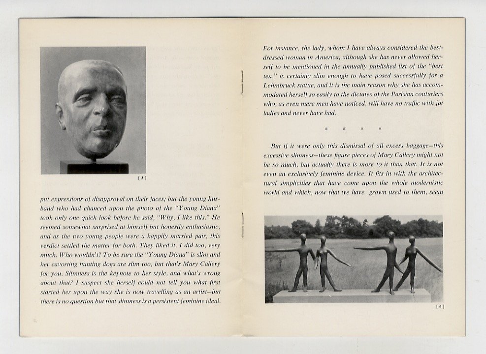 New York, Curt Valentin Gallery (32 East 57th Street), 1952, in-16, br. editoriale azzurra con scultura dell'artista (Orpheus) alla coperta anteriore, pp. (12). Con 10 illustrazioni in b.n. e introduzione al catalogo di Henry McBride. Esponente americana dell'Espressionismo Astratto, Callery (1903-1977) visse a Parigi dal 1930 al '40 frequentando Maillol, Picasso, Léger, Matisse, Calder;all'invasione tedesca della Francia ritornò negli Stati Uniti ove fu promotrice del modernismo europeo, anche grazie alle numerose opere di Picasso da lei acquisite e riportate in patria. Rappresentata da prestigiosi mercanti d'arte quali M. Knoedler e Curt Valentin, presso la cui galleria tenne ben 5 esposizioni dal 1944 al 1955. Ottime condizioni.