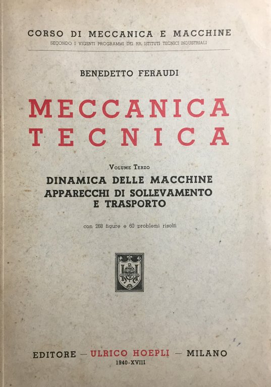 Volume terzo: Dinamica delle macchine � apparecchi di sollevamento e trasporto. Illustrazioni in nero n.t. Corso di Meccanica e macchine. Intonso. 620 � Ba In Ottavi (15-23cm ) Ottimo (Fine) Ottimo