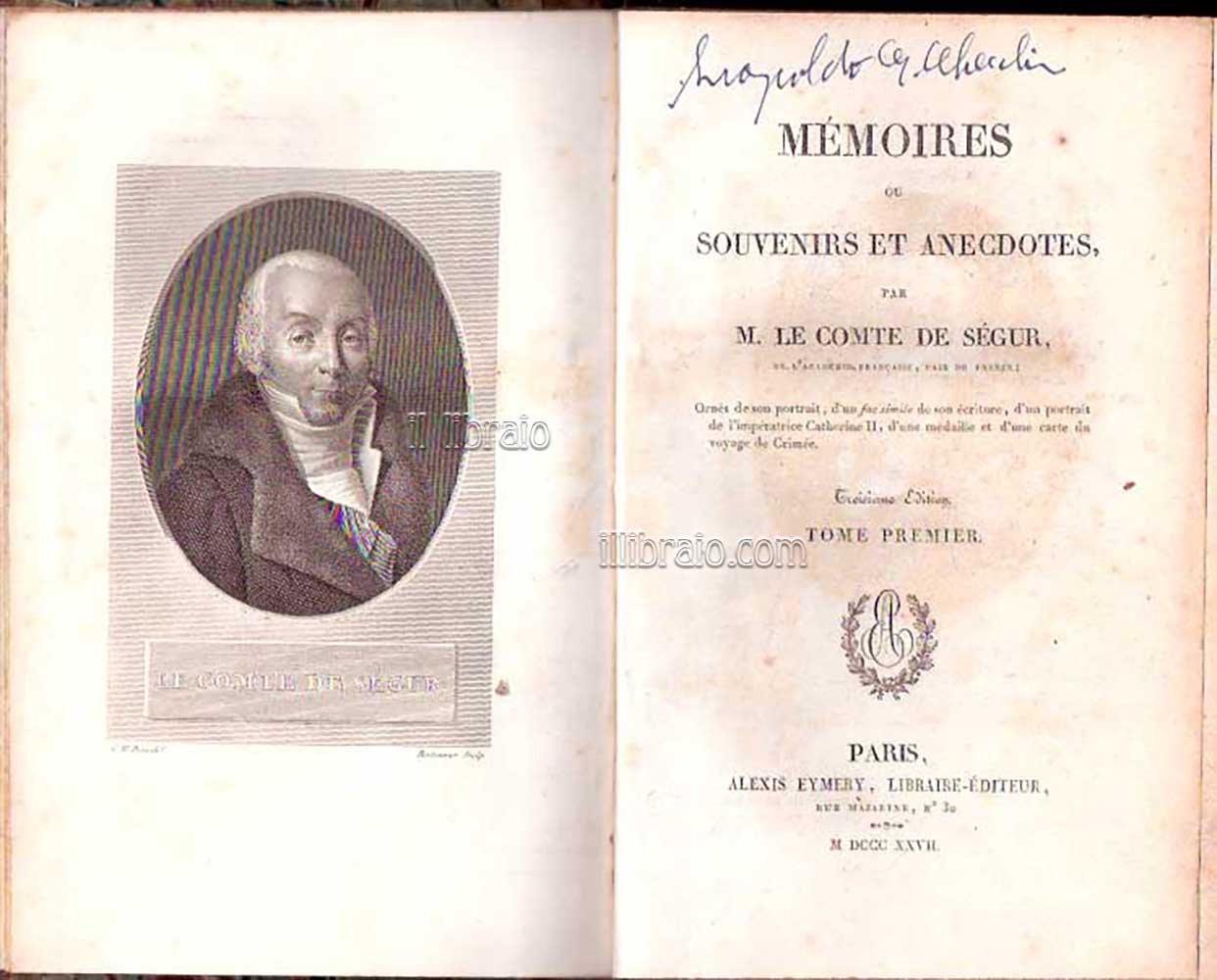 3 voll.; in 8°; pp. 476; 424; 526 + 4 tavv.(2 ritratti dell'imp. Caterina II - uno su una medaglia - 1 ritratto dell'autore, una cartina del viaggio in Crimea dell'imperatrice); leg. in mezza pelle con titolo e fregi su tassello al dorso. L'aut. fu ministro plenipotenziario a S. Pietroburgo per 4 anni. Lo storico Bilbasov ritiene queste memorie un'importantissima fonte di notizie sulla vita di "Caterina la Grande"