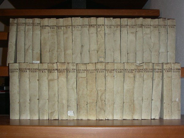 39 (su 44) voll. in-16, leg. cart. rust. coevo con tit.mss ai d. La nostra serie raccoglie 39 voll. mancando i volumi 16, 17, 18, 29, 39. Il vol. X è doppio perchè suddiviso in 2 parti. Gli ultimi voll., a partire dal vol. XXXI, contengono gli Indici alfabetici generali per articolo. Opera bibliografica e principale del Niceron (1685-1738) contenente 1600 "articoli" con precise schede bibliografiche, ancora molto utile per le notizie di grande erudizione contenute. Rara ediz. orig. Qualche lieve brun. ma bell'esempl. in barbe. [161]