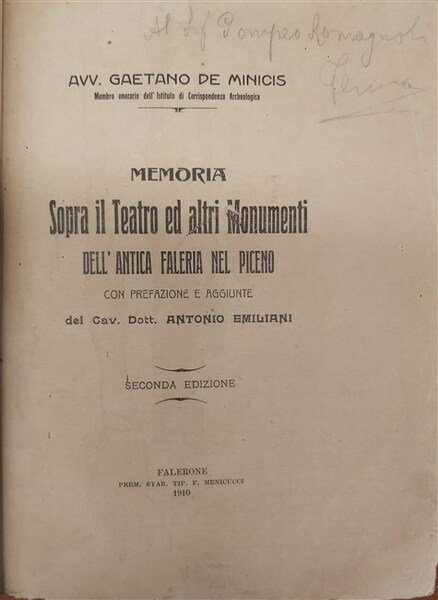 MEMORIA SOPRA IL TEATRO ED ALTRI MONUMENTI dell'Antica Faleria nel Piceno. Con prefazione e aggiunte del Cav. Dott. Antonio Emiliani. Seconda edizione.