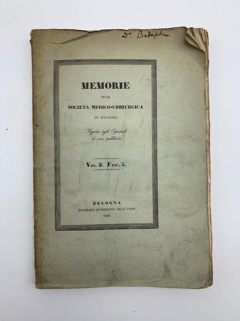 In 19 x 28, pp. (8) + da 533 a 664 con 3 grandi tavole in litografia piu' volte ripiegate. Brossura editoriale con danni riparati. Fascicolo delle Memorie della Societa' medico - chirurgica di Bologna interamente dedicato a questo importante studio letto nelle sedute del 1 settembre e 1 ottobre 1840 e considerate una pietra miliare della ortopedia italiana. Alla base dei suoi studi v'era la chirurgia sperimentale e l'anatomia patologica sui cadaveri. Il suo metodo consisteva nel provocare lussazioni nei cadaveri, e poi studiare in termini anatomo - patologici muscoli, legamenti e capsula articolare in modo da comprendere gli ostacoli che si opponevano alla riduzione. '.per quanto concerne la patologia dei femore, nella magistrale monografia <em>Memorie di chirurgia sperimentale sulle lussazioni traumatiche del femore</em>, Bologna 1841, il F., sulla scorta delle osservazioni anatomopatologiche in corso di lussazioni provocate sperimentalmente, pote' distinguere con precisione fra quanto concerne la frattura da una parte e la lussazione del collo del femore dall'altra.'. Fabbri, nato a S. Michele in Bosco, presso Bologna, divenne medico a 20 anni. Si occupo' in particolare di ostetricia e e ortopedia, occupo' diverse cattedre, tra queste Bologna e Camerino. Particolarmente originali i suoi apporti in campo ortopedico, in particolare per quanto riguarda le lussazioni del pollice e le patologie del femore