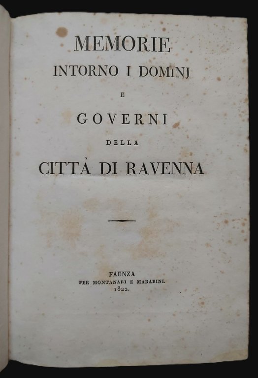 in-8 gr., pp. IX, 230, (2), bella leg. m. pelle con fregi, tit. oro al d. e carta dec. ai piatti. La prima parte è la storia di Ravenna in forma di annali, mentre la seconda riguarda la storia delle famiglie illustri ravennati: i De’ Traversari e i De’ Polentani, anche queste in forma di annali. Manca a Lozzi. Platneriana 278: “Raro”. [432]