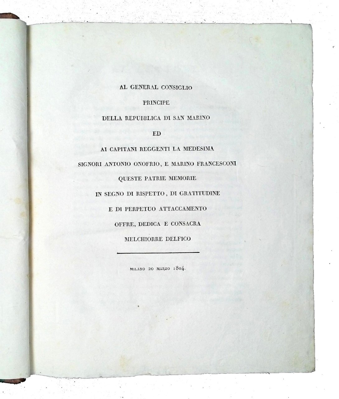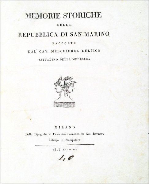 in-4° (252x208 mm); legatura del sec. XIX in mezza pelle marrone e carta verde ai piatti, dorso liscio a falsi nervi decorati in oro, titolo dorato in casella al dorso, guardie bianche non coeve; pp. 264, LXXVII, (2), (1 b.); frontespizio in b/n con marca tipografica. Edizione originale di questa opera storica che costituisce un raro e approfondito studio sulla corografia e la storia di San Marino, dalle origini alle prime attestazioni documentarie dell’XI secolo, fino all’analisi della forma di governo del primo Ottocento. Il testo è preceduto dalla dedica "al General Consiglio Principe della RSM ed ai Capitani reggenti la medesima" fatta dall'Autore a Milano il 20 marzo 1804, poi dall'avviso al lettore e dalla prefazione; a fine testo, una ampia "Appendice de' diplomi ed altri monumenti citati nell'opera". Melchiorre Delfico (1744-1835), filosofo e uomo politico abruzzese, illuminista, prese parte alla rivoluzione napoletana del 1799, compose opere giuridiche, storiche e filosofiche durante il suo esilio a San Marino. Rif.: IT\ICCU\SBLE\013006. OCLC, 260128516. Lozzi 4728. Cond.: Frontespizio leggermente brunito; per il resto trattasi di esemplare in carta perfetta, croccante, ad ampi margini. -- ORIGINAL EDITION OF A RARE AND IN-DEPTH STUDY ON THE CHOROGRAPHY AND HISTORY OF SAN MARINO. Title page lightly browned; otherwise, copy in perfect condition, in a crispy paper and with wide margins.