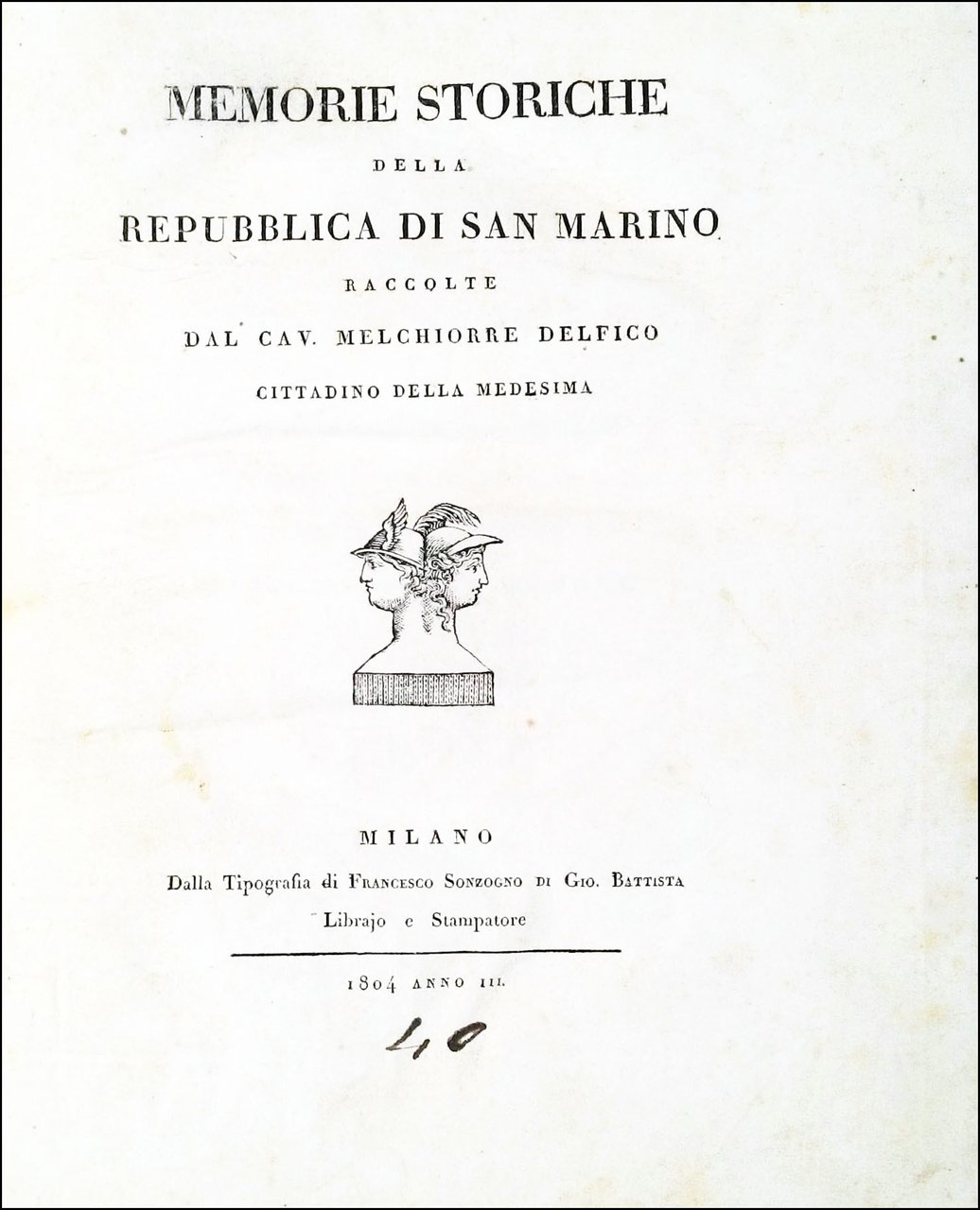 Memorie storiche della Repubblica di San Marino raccolte dal Cav. Melchiorre Delfico cittadino della medesima.