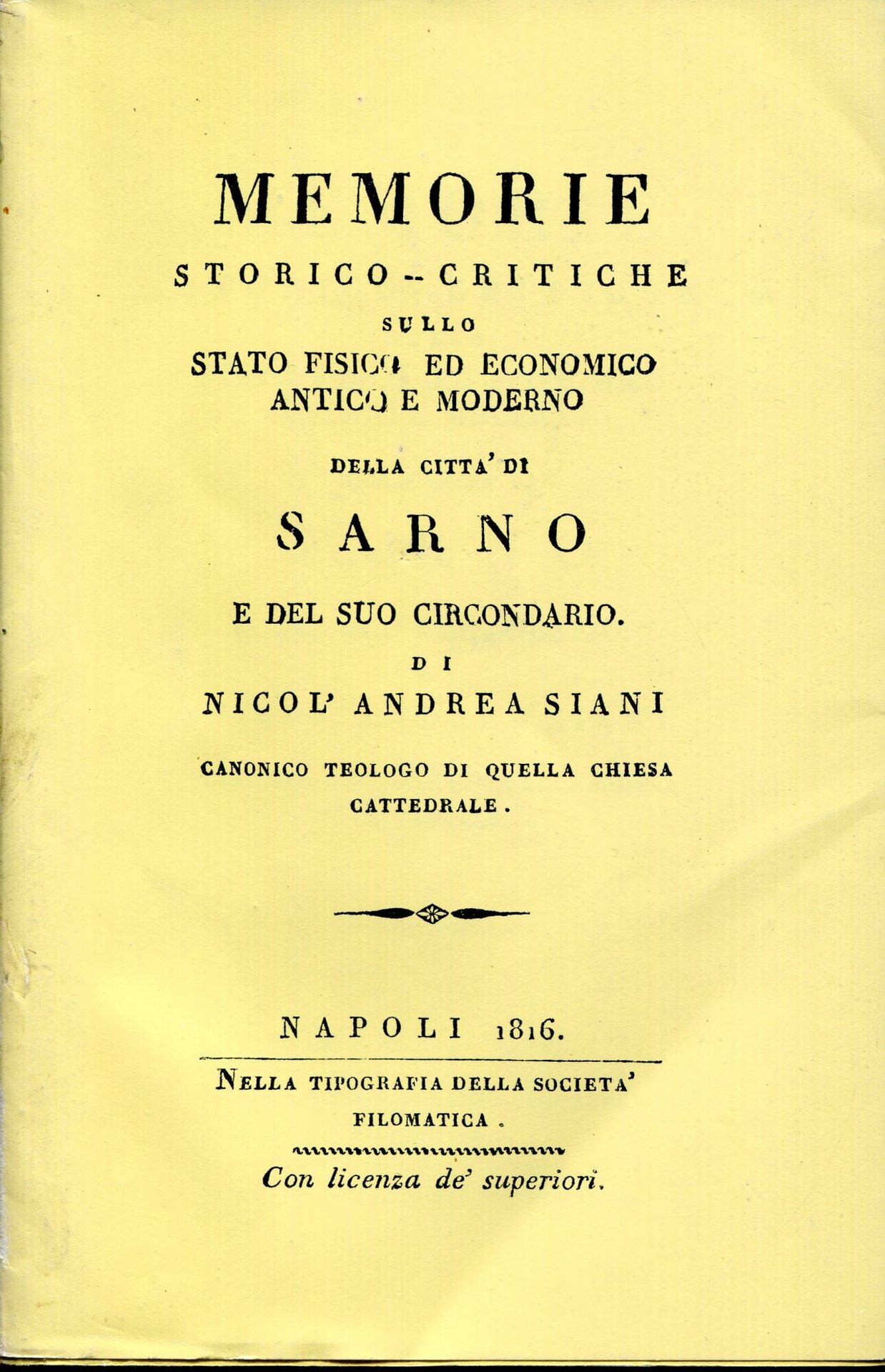 Memorie storico-critiche sullo stato fisico ed economico antico e moderno della città di Sarno e del suo circondario. Riproduzione anastatica dell'ed. : Napoli : tipografia della societa filomatica, 1816