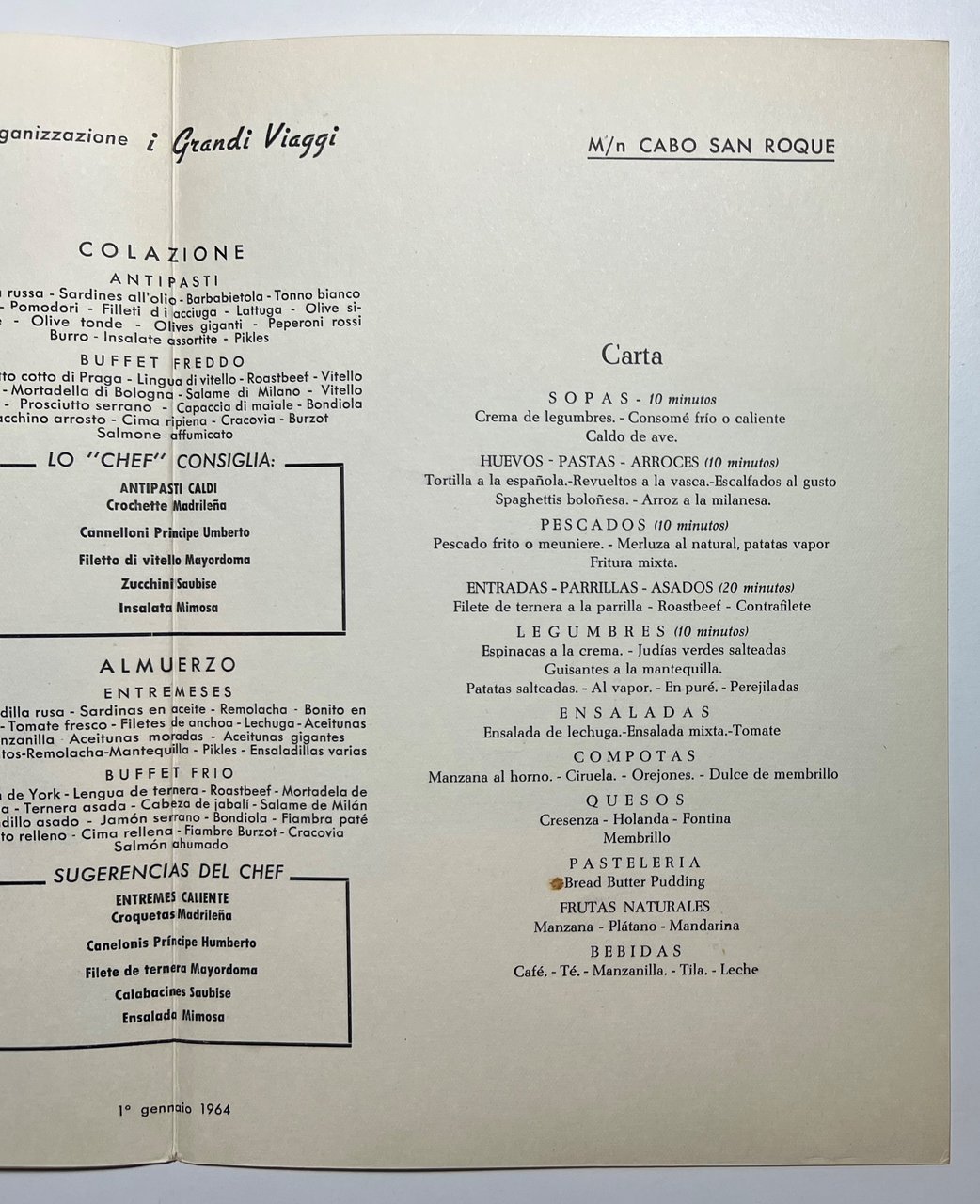 Menu Viaggi - Crociera di Capodanno - M/N Cabo San Roque - 1 Gennaio 1964