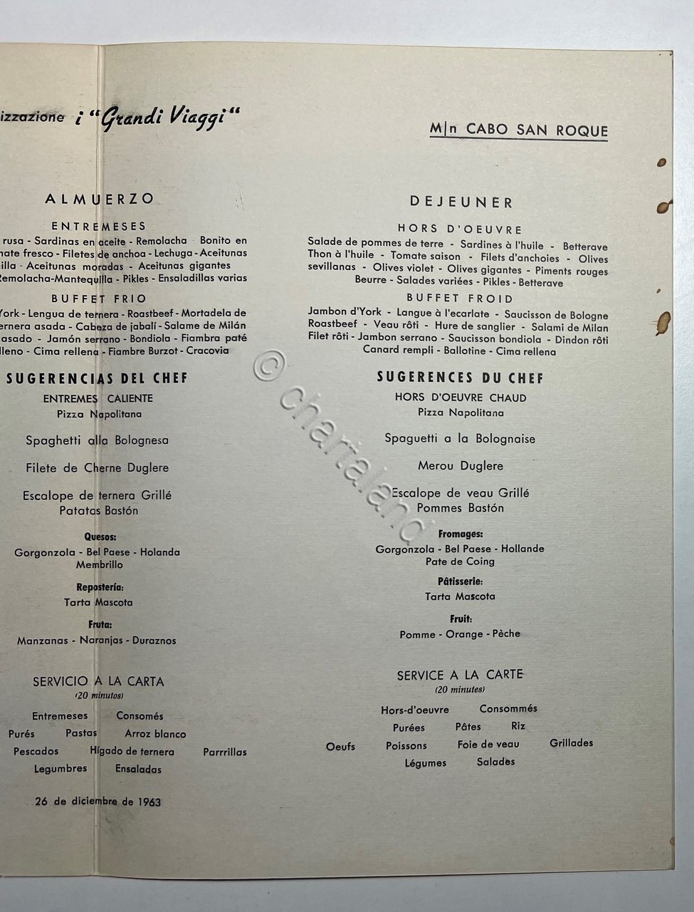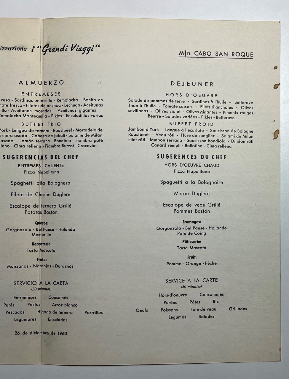 Menu Viaggi - Crociera di Capodanno - M/n Cabo San Roque - 26 Dicembre 1963
