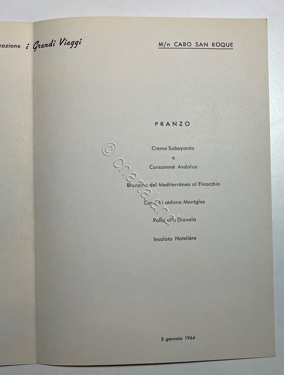 Menu Viaggi Crociera di Capodanno - M/N Cabo San Roque - 5 Gennaio 1964