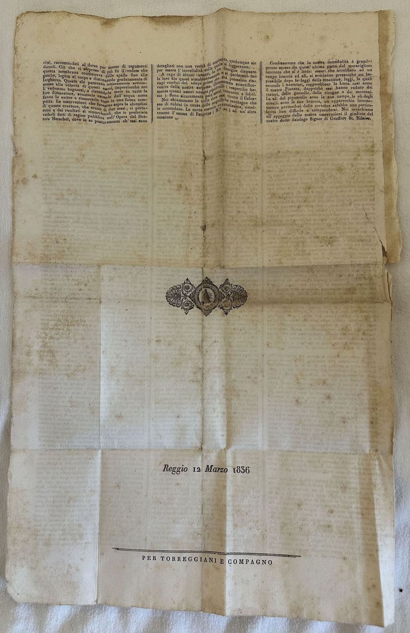 Rara e curiosa edizione italiana del 12 marzo 1836 di uno dei sei articoli sulle presunte scoperte lunari atribuite all'astronomo inglese John Herschel (1792-1871) già introdotte in Italia dall'astronomo, matematico fisico e politico Dominique Francois Jean Arago (1786-1853). Il contenuto di questo opuscolo finì al centro di un lungo dibattito definito in seguito "Great Moon Hoax" "La grande burla della Luna". Il giornalista americano John Locke decise di pubblicare una serie di articoli sul New York Post descrivendo le scoperte del celebre astronomo britannico Herschel che, con l'ausilio di un potente telescopio collegato a un proiettore alimentato a "idro-ossigeno", affermava di aver visto chiaramente la vita sulla luna: creature fantastiche, foreste, mari, giacimenti minerari. Locke nel suo articolo citava fonti scientifiche attendibili e le descrizioni sembravano cosi veritiere che in breve la notizia ebbe molta risonanza e circolò su numerose testate internazionali. Solo qualche anno dopo Locke ammise l'inganno. Negli stessi anni Edgar allan Poe pubblicò un articolo simile e accusò Locke di plagio. La pubblicazione presenta numerose piegature e lievi usure marginali. In discrete condizioni. Copertina assente. Legatura in buone condizioni. Pagine in buone condizioni con fioriture. In folio. Dim. 45,5x29 cm. Pp. (4).Scarce and curious italian edition of 12th of march 1836 of one of the six articles about the presumed moon discoveries attrobuted to the english astronomer John Herschel (1792-1871) already introduced in Italy by the astronomo, mathematician physician and politician Dominique Francois Jean Arago (1786-1853). The content of this pamphlet were in the centre of a long debate that was then defined "Great Moon Hoax" "La grande burla della Luna". The american journalist John Locke decided di publish a series of articles in New York Post describing the discoveries of the famous british astronomer Herschel that observed different strange animals, mines, seas and forests using a potent telescope. Locke in his article cited scientiphic articles and descriptions seems so true that in a brief time the information circulated in different internation magazines. After some year Locke admitted the fraud. In the same years Edgar allan Poe published a similar article and accused Locke of plagiarism. The pamphlet have different foldings and light tears in the foldings and edges. In fair conditions. Cover is missing. Binding in good conditions. Pages in good conditions with foxing. In folio. Dim. 45,5x29 cm. Pp. (4).