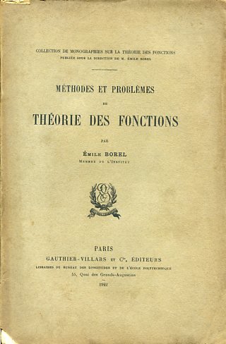 In-8°, pp. IX, 146, (2), brossura editoriale. Minimali restauri alla sovraccoperta. Intonso, in ottimo stato. Edizione originale di questo studio sulle funzioni del celebre matematico e uomo politico francese (Saint-Affrique, 1871-Parigi, 1956). Indice: Les domaines et la théorie des fonctions - Les opérations et les développements en série - La théorie de la croissance et le rôle des constantes arbitraires - Les fonctions de variable complexe, en général, et les fonctions particulières - Conclusion et table. Collection de monographies sur la théorie des fonctions publiées sous la direction de M. Émile Borel. 'Professore alla facoltà di scienze di Parigi, direttore scientifico di quella Scuola normale superiore, membro dell'Accademia delle scienze di Parigi, socio straniero dei Lincei (1918); a lui si debbono risultati importanti e vedute suggestive in campi svariati dell'analisi matematica: serie divergenti, teoria degli insiemi (misurabilità di un insieme, ecc.), teoria delle funzioni di variabile reale, delle funzioni analitiche uniformi, ecc. Fondatore di una Collection de monographies sur la théorie des fonctions (1898), il suo nome è anche legato al grande Traité du calcul des probabilités et de ses applications (1925). Caposcuola dell'empirismo matematico, nella prima guerra mondiale il Borel si occupò anche di applicazioni della matematica alla tecnica militare (metodi per la individuazione delle batterie).' (Treccani online). DSB, II, 302.