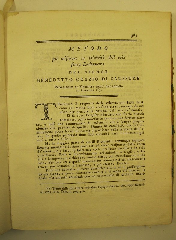 In 8, pp. 383-386. Br. rifatta con carta d'epoca. Stralcio da 'Opuscoli scelti sulle scienze e sulle arti tratti dagli Atti delle Accademie e dalle Collezioni Filosofiche, e Letterarie', vol. III, primo periodico scientifico milanese edito dal 1778 al 1803 che, sotto la cura di Carlo Amoretti e Francesco Soave, raccoglieva saggi e memorie dei principali scienziati dell'epoca.
