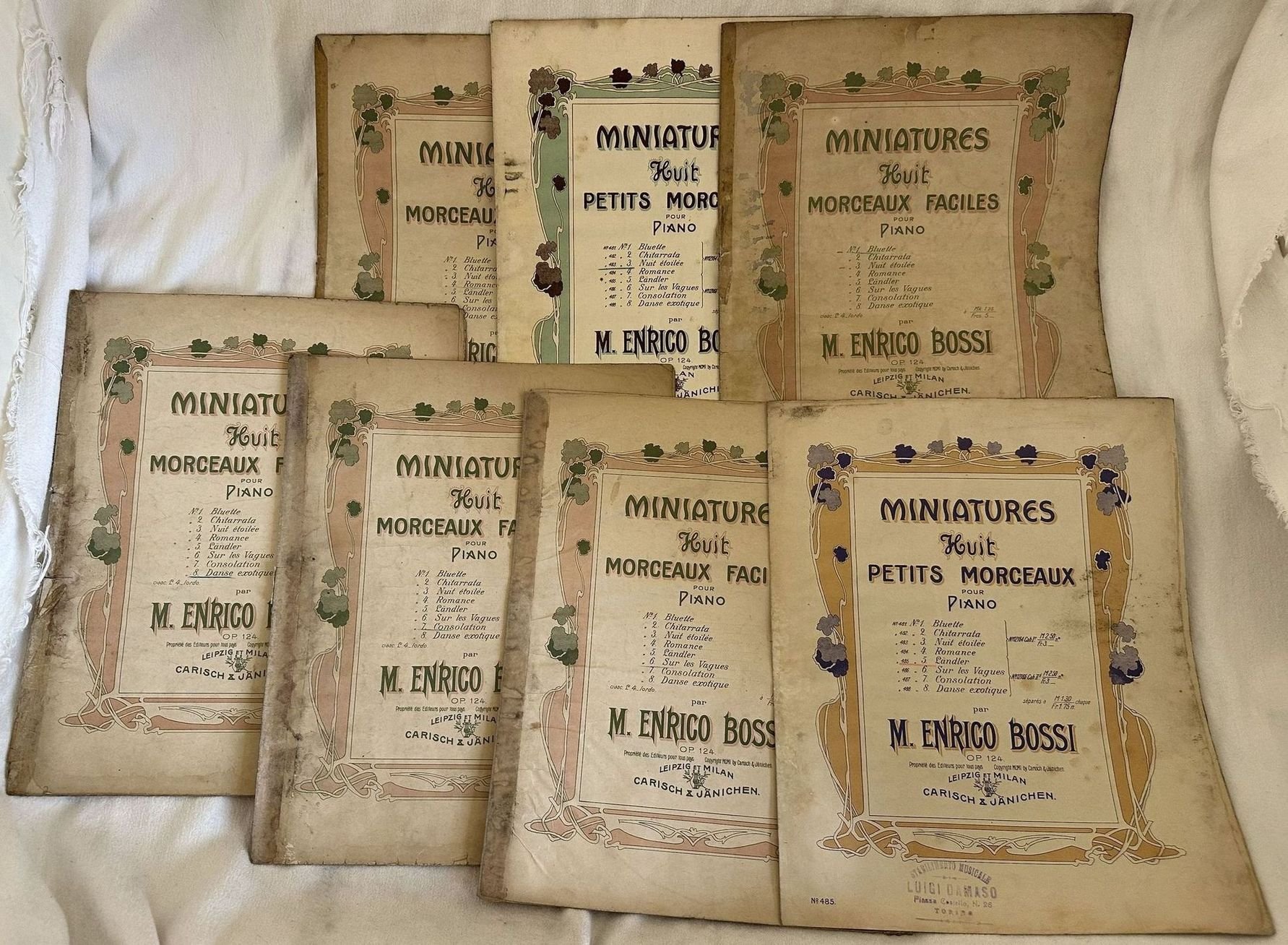 Edizione del 1901 di questa raccolta di otto melodie facili dall'opera 124del compositore e organista Enrico Bossi (1861-1925). La melodia numero due "Chitarrata" risulta mancante. Decorazioni in copertina. In mediocri condizioni. Copertina editoriale in discrete condizioni con usure marginali. Rinforzo ai dorsi. Legatura quasi assente. Pagine in discrete condizioni con fioriture. Segni di umidità e muffa ai margini. In Folio. cm. 34x27. Pp. 6, 6, 6, 6, 6, 6, 6.Edition of 1901 of this collection of eight simple melodies from the opera 124 by the composer Enrico Bossi (1861-1925). The melody number two "Chitarrata" is missing. Decorations in the cover. In poor conditions. Editorial cover in fair conditions lightly worn in the extremities. Reinforcements in spines. Binding almost missing. Pages in fair conditions with foxing. Dump stains and mould signs in the edges. In Folio. cm. 34x27. Pp. 6, 6, 6, 6, 6, 6, 6.