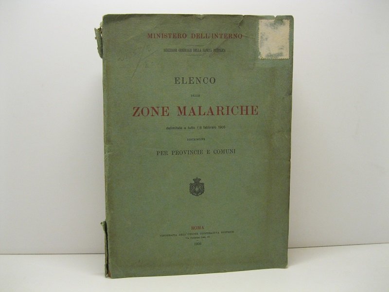 Ministero dell'Interno. Direzione generale della Sanita' pubblica. Elenco delle zone malariche delimitate a tutto l'8 febbraio 1906 distribuite per provincie e comuni
