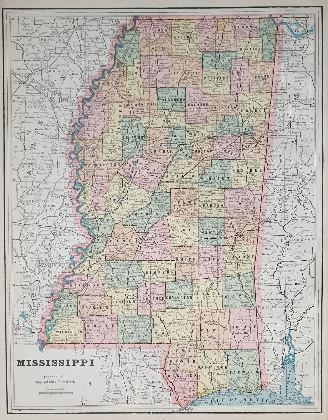 Bellissima mappa colorata del Mississipi. Al verso mappa colorata di Birmingham. Autore: George F. Cram Atlante: Standard American atlas of the world Data: 1890 circa Tecnica: litografia Dimensione del foglio: 36,5x29 cm Dimensione dell'incisione: 33x26 cm Condizioni:Buone. Very beautiful page coloured map of Mississipi In the verso coloured map of Birmingham. Author: George F. Cram Atlas: Standard American atlas of the world Date: 1890 circa Technique: lythography Leaf Dimension: 36,5x29 cm Engraving Dimension: 33x26 cm Conditions: Good conditions.