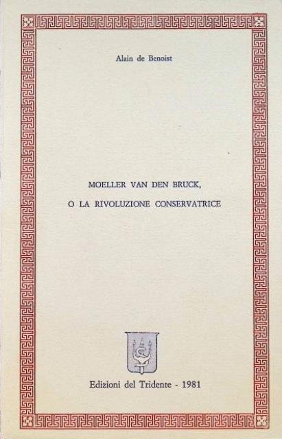 82 p. ; 21 x 13 cm. Aletheia, 2. Il libro è un'analisi del pensiero di Moeller van den Bruck (1876-1925), figura centrale della "Rivoluzione conservatrice", un movimento intellettuale tedesco degli anni '20 e '30. De Benoist, attraverso questo studio, esplora i temi centrali della Rivoluzione conservatrice, come la critica al liberalismo e alla modernità, il ruolo del nazionalismo e la valorizzazione della tradizione, ponendo Moeller van den Bruck come un pensatore chiave nella comprensione di questo movimento che ha alimentato diversi filoni della nuova destra europea nella seconda metà del Novecento. Brossura editoriale, coperta in cartoncino flessibile di colore marrone chiaro con titolo impresso in blu al piatto e al dorso, con alette. Codice libreria 9974.