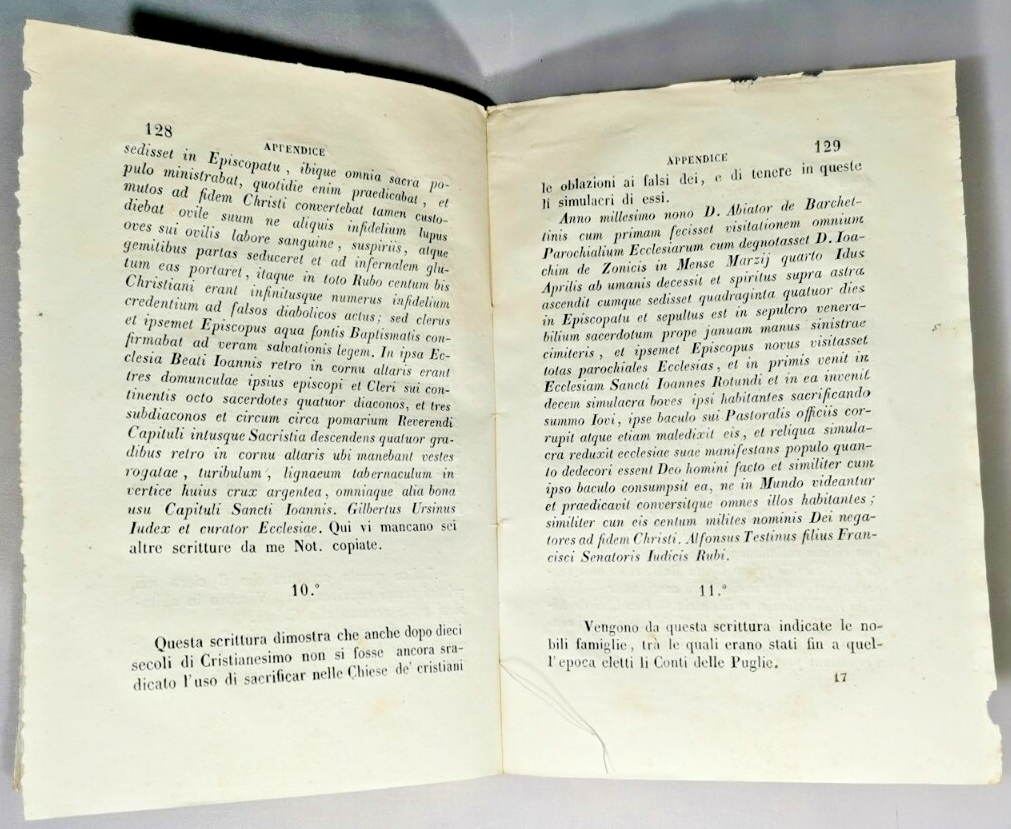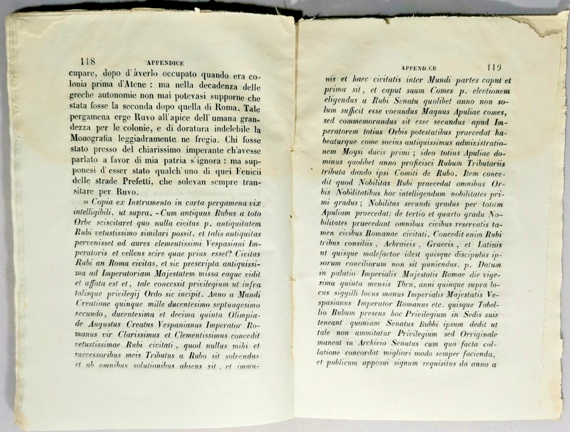 MONOGRAFIA DI RUVO DI MAGNA GRECIA di Salvatore Fenicia Napoli, stamperia di Salvatore Piscopo, 1857. XII + 136 pagine. Copertina in carta muta. Dimensioni: 13.5 x 19.5 cm. Stato di conservazione: buono (poche fioriture, gora d'umido al margine superiore dell'ultima metà del volume, piccola mancanza al margine inferiore delle ultime 6 pagine)