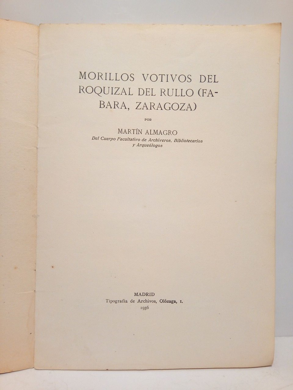Madrid: Tip. de Archivos, 1936.- 8 p.: 2 Láminas; 4º (24,3 x 17 cm); Cartulina Ed.- (Tirada aparte del "Anuario del Cuerpo Facultativo de Archiveros, Bibliotecarios y Arqueólogos". Madrid, 1936, Vol. III).- RARO.* La cubierta anterior con motas de óxido en el margen duperior y algun pequeño ribete de humedad. Interior en perfecto estado. PALEONTOLOGÍA, PREHISTORIA Y PROTOHISTORIA