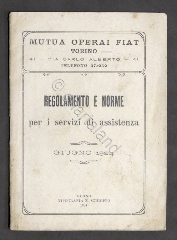 Mutua Operai Fiat Torino - Regolamento e Norme per Servizi di Assistenza - 1924