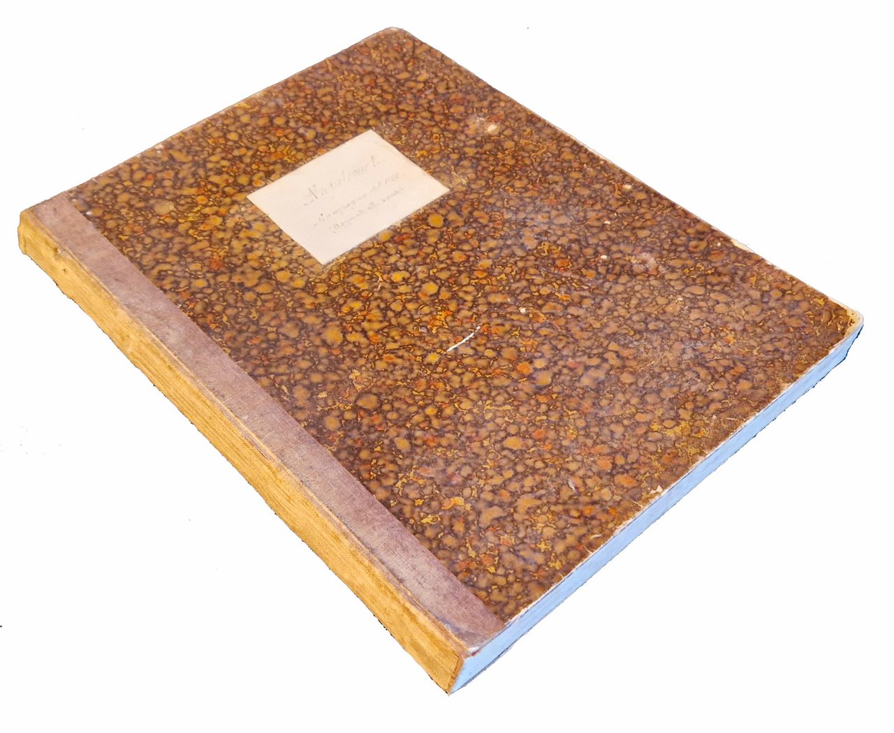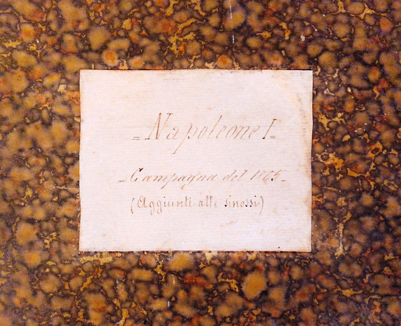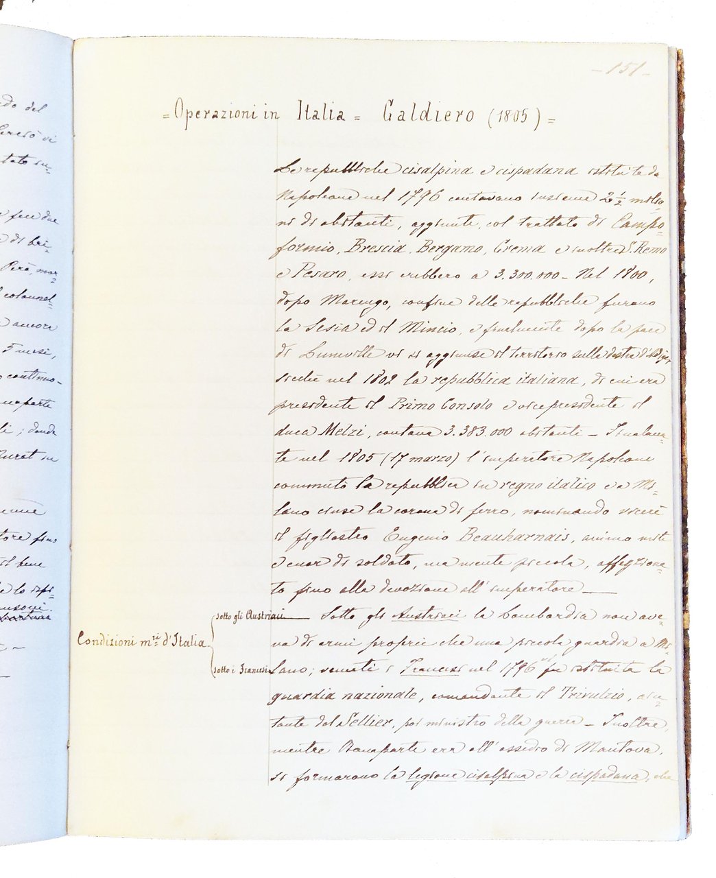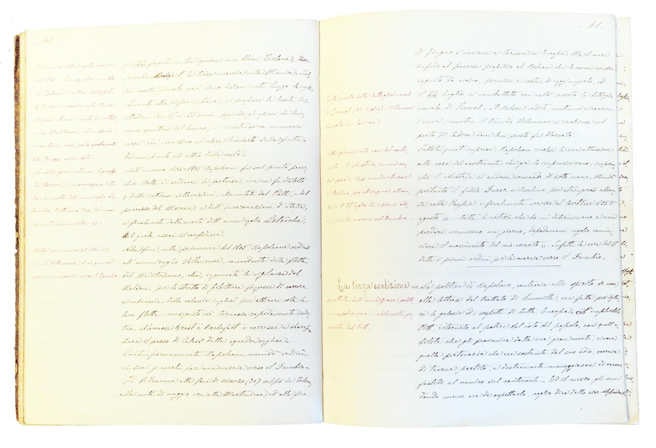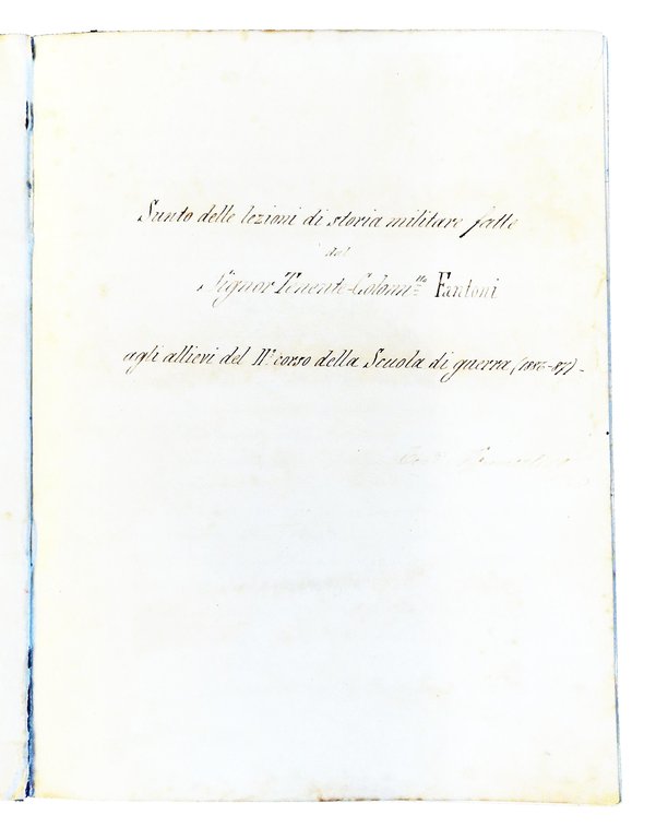 Manoscritto su quaderno/registro, dim. 240x180 mm, riportante il riassunto delle lezioni di storia militare tenute dal Ten.Col. Fantoni alla Scuola di guerra nel 1886-1887, compilato dal Ten. Neomarlino (?), composto da 157 pp. scritte e numerate, su 188 (31 pp. bianche). Testo tutto scritto da una sola mano con inchiostro nero, con sottolineature e con annotazioni a margine scritte con inchiostro rosso. Legatura rigida in cartonato coevo, con dorso in tela e piatti rivestiti in carta marmorizzata, tagli spruzzati di rosso, etichetta bianca al piatto ant. con scritto "Napoleone I. Campagna del 1805 (aggiunte alle sinossi)"; presenza di etichetta "marca di fabbrica" incollata al contropiatto anteriore, con lo stemma e il nome della Ditta Carlo Simondetti - Torino, che ha realizzato il quaderno/registro. Cond.: Esemplare molto buono.