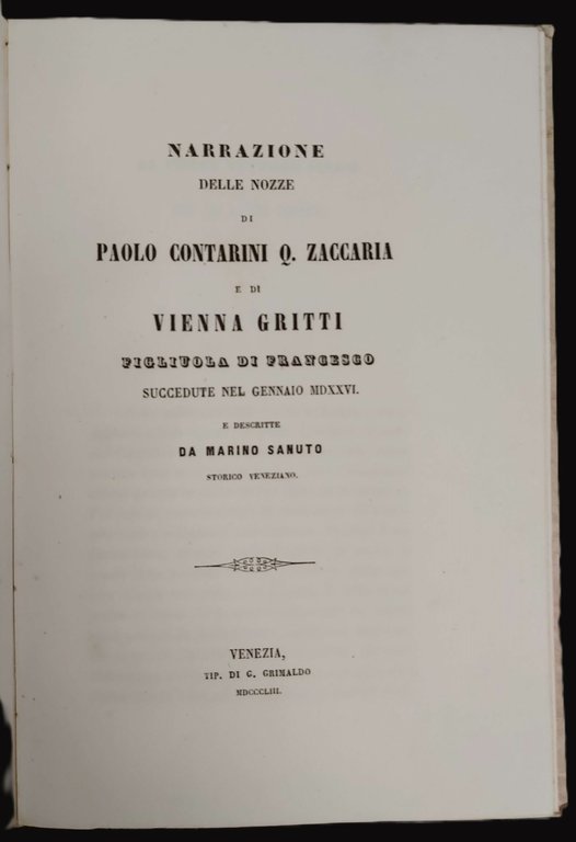 NARRAZIONE DELLE NOZZE di Paolo Contarini Q. Zaccaria e di Vienna Gritti figliola di Francesco, succedute nel gennaio MDXXVI. Descritte da. storico veneziano.