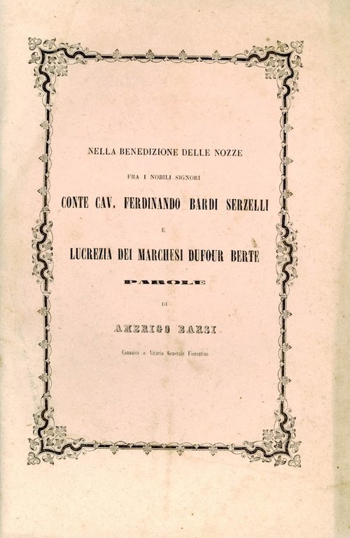 Nella benedizione delle nozze fra i nobili signori conte cav. Ferdinando Bardi Serzelli e Lucrezia dei marchesi Dufour Berte