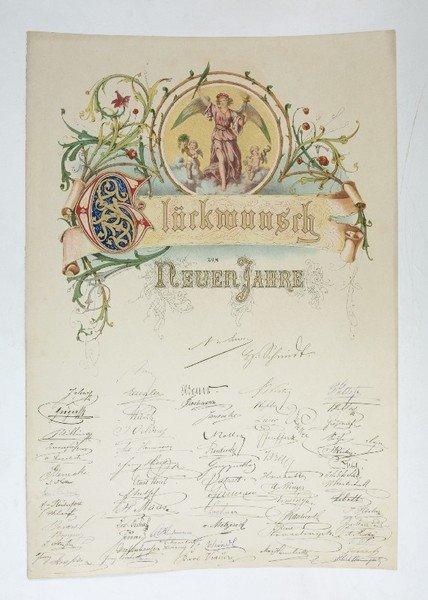 Neujahrs-Glückwunschadresse des Beamtenstabs der österreichischen Staatseisenbahn-Gesellschaft für Leopold Bresson zum Jahreswechsel 1875/76.