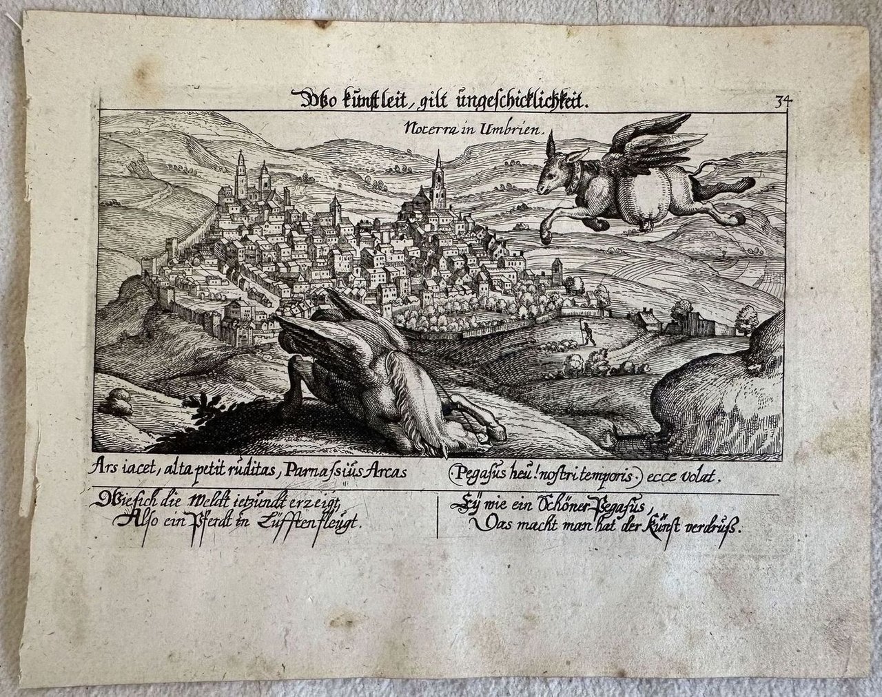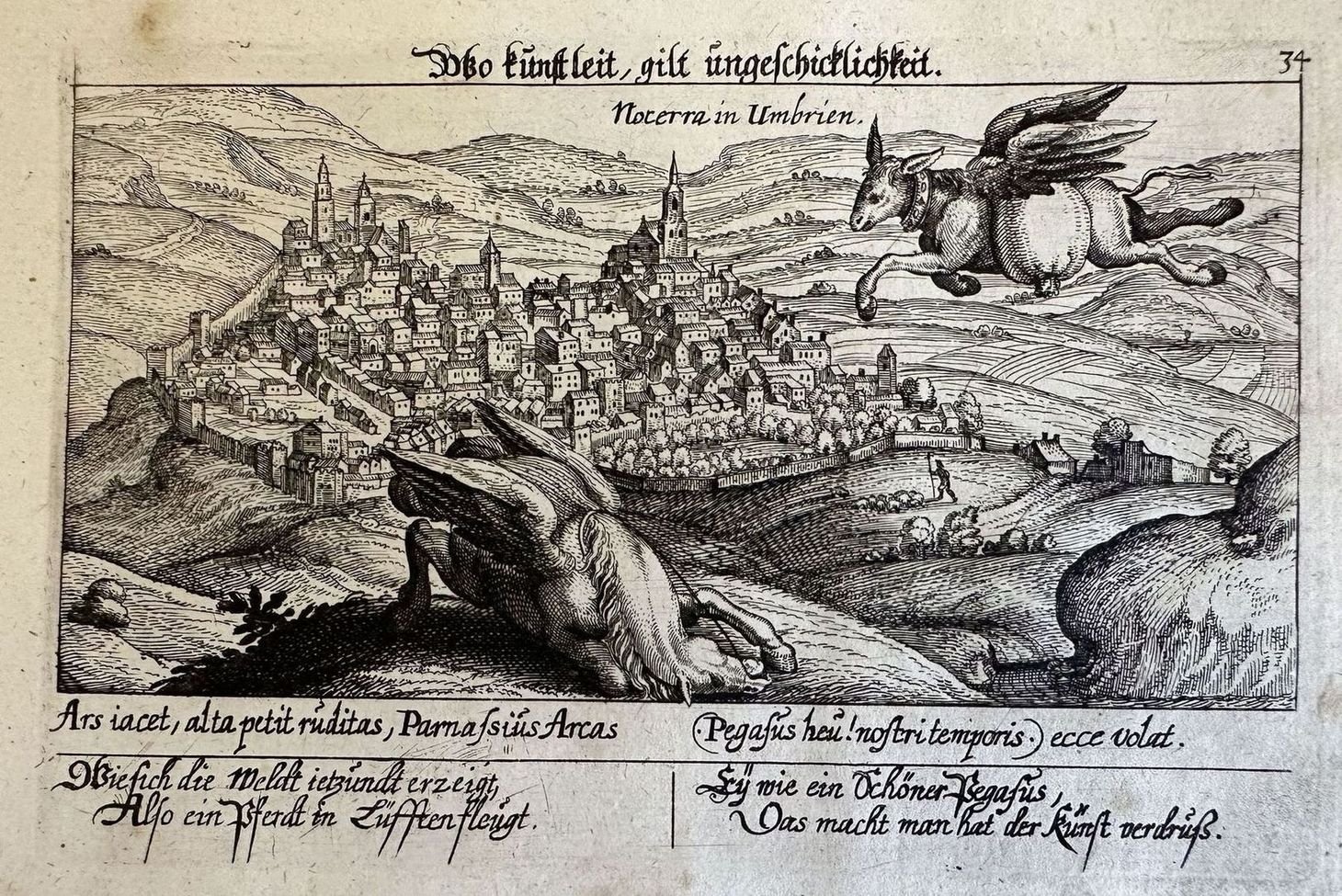 Finissima veduta di Nocera Umbra tratta dalla celebre opera di Daniel Meisner "Thesauri philo-politici" stampata a Francoforte nel 1626. In primo piano dei cavalli alati e sullo sfondo la città di Nocera Umbra. Autore: Daniel Meisner (1585-1625) Data: 1626 Tecnica: Acquaforte Dimensione del foglio: 178x140 mm Dimensione incisione: 150x100 mm Condizioni: Buone. Rare fioriture.Very fine view of Nocera Umbra taken form the famous work of Daniel Meisner "Thesauri philo-politici" published in Francoforte in 1626. SOme winged horses and in the back the city of Nocera Umbra. Author: Daniel Meisner (1585-1625) Date: 1626 Technique: etching Leaf Dimension: 178x140 mm Engraving Dimension: 150x100 mm Conditions: Good conditions. Occasional foxing.<BR><BR>