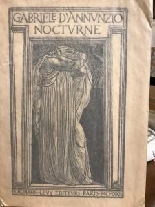 [vt] Traduzione in francese del Notturno a cura di Andret Doderet. Copertina e alcune illustrazioni xilografiche di De Carolis. Conservata la scheda editoriale originale. Normale brunitura della carta, molto ben conservato. Pagg. 318. Brossura edit. ill. con velina protettiva. Mis mm 250x145