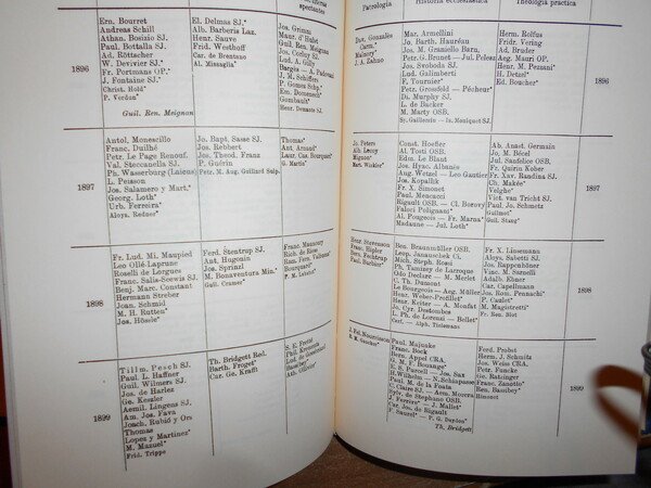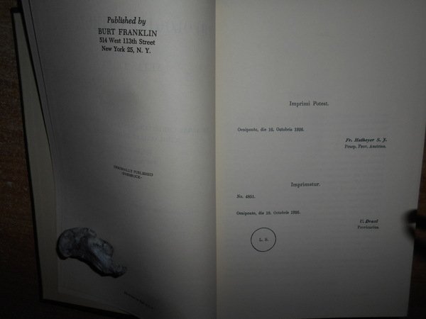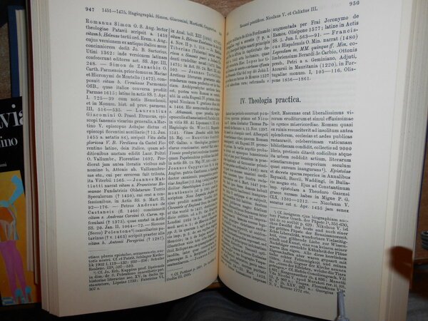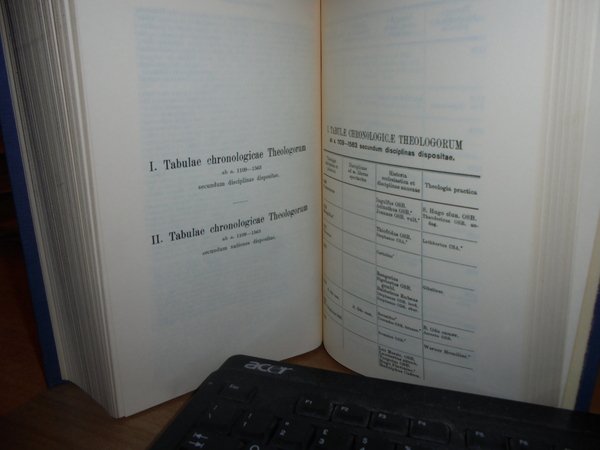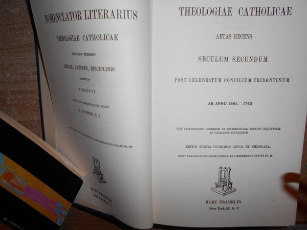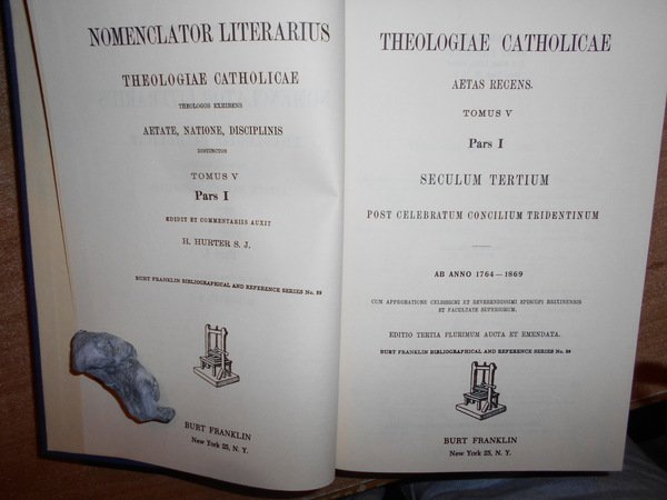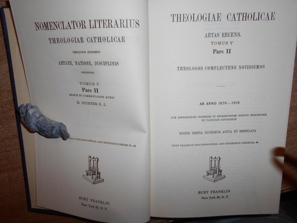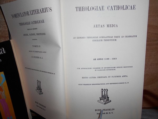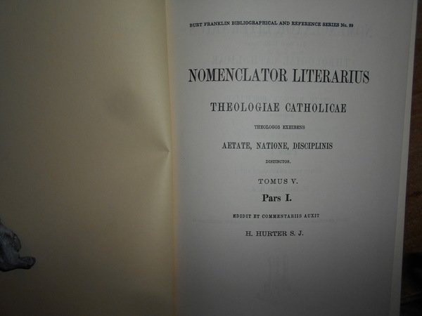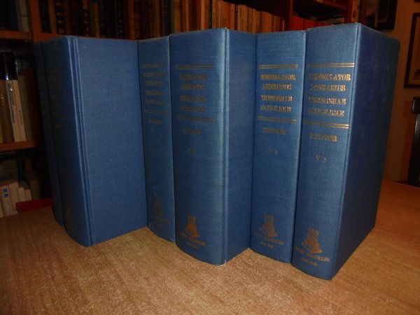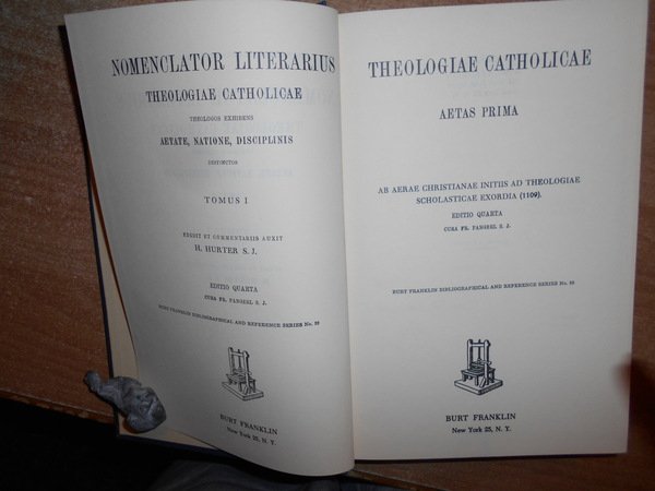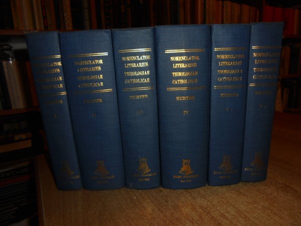 H. HURTER. New York, Burt Franklin, 1926. NOMENCLATOR Literarius Theolgicae Catholicae. 6 volumi in-8°, tela edit. con titoli in oro al dorso. Aetas Prima: ab aerae christianae initiis ad theologicae scholaticae exordia (1109). xv, 1100 numerato a a due colonne. Aetas Media: Ab exordiis theologicae scholasticae usque ad celebratum Concilium Tridentinum. 1590 numerato a due colonne, CLXXXII pp. tabulae chronologicae Theologorum. I. II. Aetas recens. Post celebratum Concilium Tridentinum secolum primun ab anno 1564 - 1663. 1224 numerato a due colonne, CXXII pp. tabulae chronologicae Theologorum. I. II. Aetas Recens Secolum secundum Post celebratum Concilium Tridentinum ab anno 1664 - 1763. 2064 numerato a due colonne. Tomus V Pars I Secolum tertum. Tomus V Pars II Theologos complectens novissimos complessive 2091 colonne, CCLXI I. Tabulae chronologicae Theologorum secundum disciplinas dispositae ab A. 1764 - 1910. Perfetto esemplare (completo). Vendibile solo in Italia. Uff. E - IV - 3 - 2