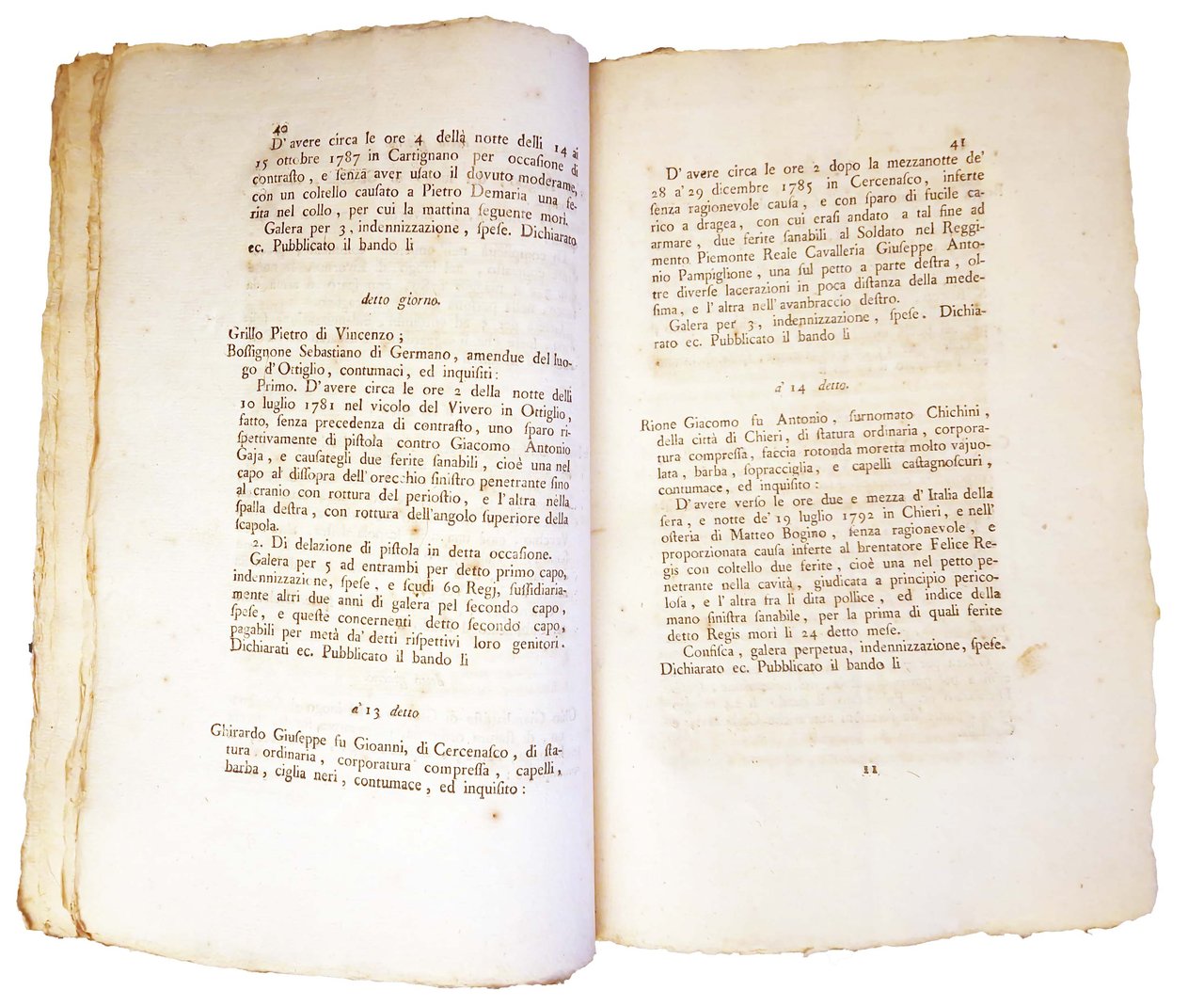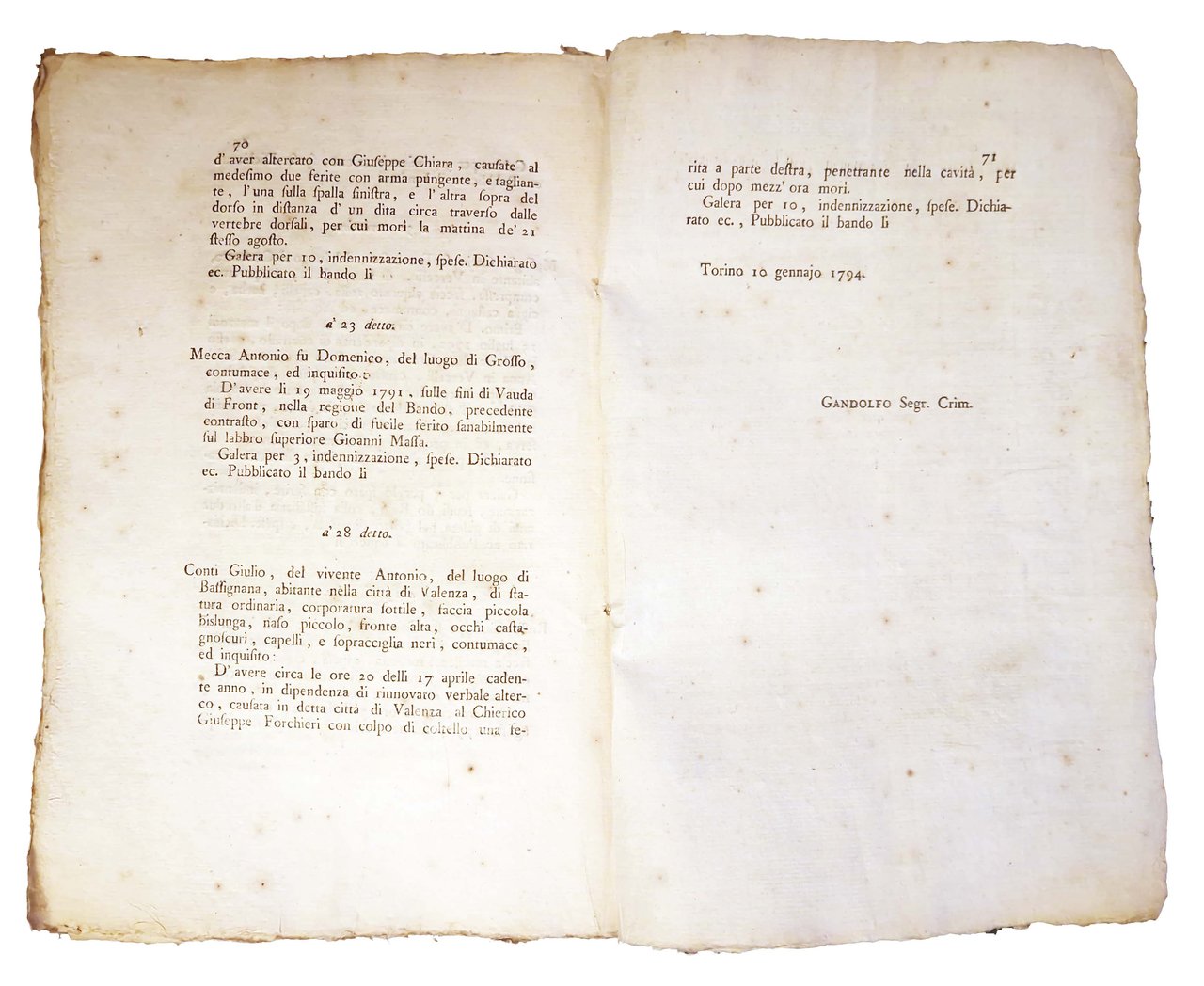 Un volumetto in-folio piccolo, 320x210 mm, 18 fogli per un totale di 71 pagine (+ 1 bianca) senza legatura. Stemma reale al frontespizio. Interessante documento di carattere storico e legale, redatto dal Senato di Piemonte (o "Reale Senato" nel periodo del Regno di Sardegna); questo elenco ufficiale, in cui erano registrate nominativamente le persone bandite con la descrizione del loro aspetto fisico e dei reati commessi, veniva pubblicato con cadenza regolare, ad esempio annuale, a intervalli che comprendevano anche più anni. Rif.: IT\ICCU\TO0E\161542 (ed. pubblicata nel 1795). Cond.: Carte in barbe. Esemplare decisamente molto buono.