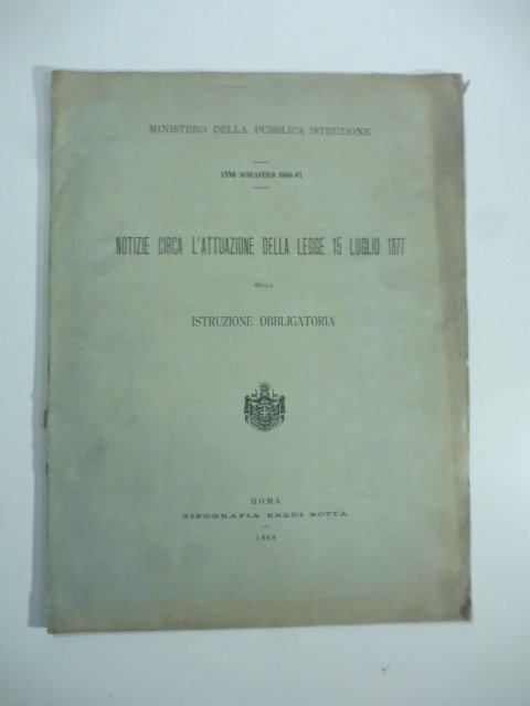 In 4 (cm 23,5 x 32), pp. 63 + (1b). Brossura editoriale con lievi danni. Pubblicazione costituita da tabelle con dati statistici relative all'attuazione delle legge sull'istruzione obbligatoria nel 1886-87; al personale insegnante nelle scuole elementari diurne pubbliche nel 1884-85; alle cifre proporzionali per le scuole diurne pubbliche per gli iscritti nel 1884-85 e alle scuole serali; ecc.