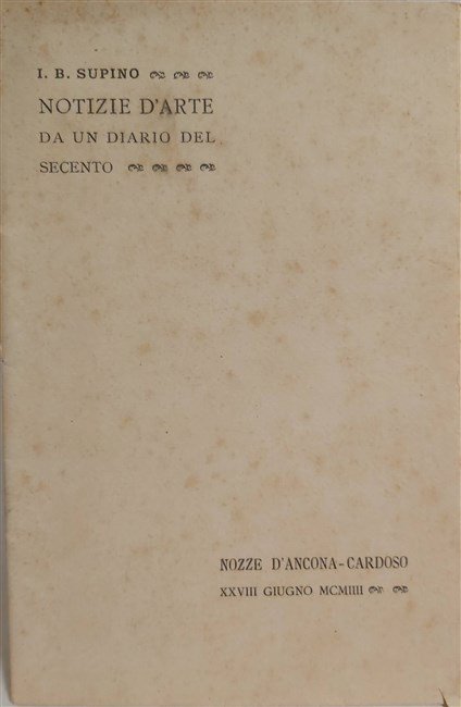 in-16, pp. 8, bross. edit. Pubblicazione d'occasione per le nozze tra Paolo D'Ancona e Mary Cardoso. Contiene notizie storico-artistiche su Firenze tratte dal Diario di Cesare di Bastiano Tinghi dal 1600 al 1625, contenuto nel codice Capponi conservato nella Biblioteca Nazionale di Firenze. Rara placchetta edita in soli 60 esempl. [238]