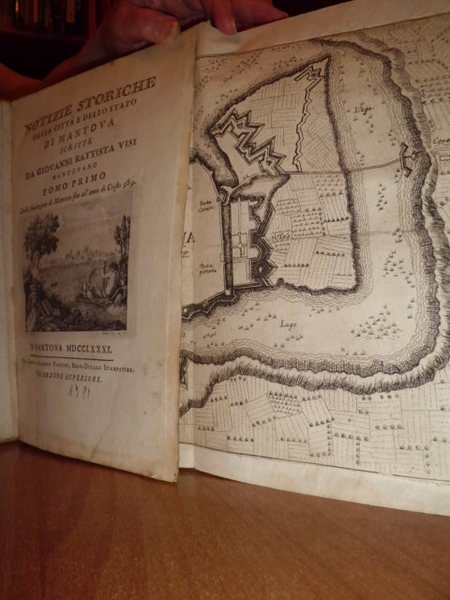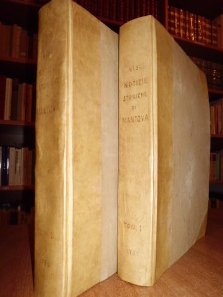 Notizie storiche della città di Mantova.dalla fondazione di Mantova sino all' anno di Cristo 989 (vol. 1°) e 1183 (vol. 2°). Visi, Giovanni Battista. Mantova, Erede di Alberto Pazzoni, 1781 - 82. 2 volumi in - 4° grande, m. pergamena con angoli ottocentesca. viii, 380 pp. con 2 carte (geografica e topografica) ripiegate f.t.; viii, 402 pp. con una tavola incisa in rame f.t. raffigurante la contessa Matilde a cavallo. Le pp. 53 - 56 sono posposte. Bell' esemplare di opera rara rimasta incompiuta per la morte dell' autore. Manca al Lozzi. Bibl. Platneriana, p. 193.