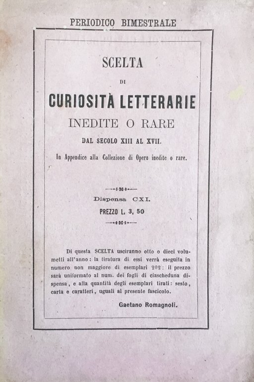 A cura di Giulio Piccini. Scelta di Curiosità letterarie inedite o rare, dispensa CXI. 853 � V In Ottavi (15-23cm ) Mediocre (Poor) Accettabile