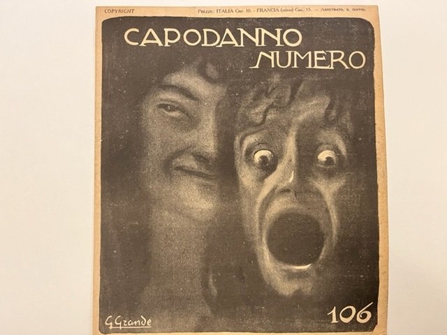 In 8 (cm 21,5 x 24,5), pp. (40) copertine comprese. Brossura editoriale. Illustrazioni in nero. Numero 106 di questa rivista satirica torinese. Illustrazioni di: Omegna, Bisca, Carlin, Nasica, Scarpelli, Camerini, Serratto. Sono presenti: Lo zodiaco. Storia illustrata dell'anno 1915; Salmo per l'avvento del nuovo anno; Cio' che avverra' a Torino nel '16; ecc. La rivista fu fondata dal caricaturista Golia (pseudonimo di Eugenio Colmo 1885-1967). Fu compagno di studi di Guido Gozzano, di cui divenne amico, e contemporaneamente comincio' a disegnare per inclinazione e diletto. Divenne ben presto illustratore, attivita' cui lo portavano anche i suoi interessi letterari e la frequentazione dei suoi amici scrittori, e caricaturista notissimo. Furono fondatori della rivista, insieme a Golia, il pubblicitario Nino Caimi, Dino Segre (in arte Pitigrilli), il disegnatore Giovanni Manca. Ebbero il sostegno di Guido Gozzano, amico appunto di Golia, e di Amalia Guglielminetti. Di piccolo formato e di esiguo numero di pagine, fu stampato all'inizio con copertina e inserto illustrato centrale a colori ma divenne poi interamente in bianco e nero gia' prima dello scoppio del conflitto per tagliare i costi. "Raffinato e mordace, dalla dichiarata posizione antigiolittiana e anticlericale, e via via dichiaratamente interventista. Ma al di la' degli schieramenti e del momento politico, la rivista si presentava nuova e brillante in ogni sua manifestazione: nei toni degli editoriali, delle novelle, dei disegni, degli scherzi in rima, dei concorsi e perfino in collaterali iniziative espositive, dedicate all'umorismo e alla caricatura. Un taglio che garanti' subito un grande successo alla rivista, che arrivo' a quintuplicare la tiratura nel giro di appena due mesi, tra il settembre e il novembre del 1914. Certo il pubblico apprezzo' anche il carattere singolare delle sue illustrazioni, alcune piu' politiche e ciniche, altre piu' aggraziate e da giornalino di moda, e la qualita' delle sue matite." (Benadusi, Rossini, Villari, "1917. L'inizio del secolo americano. Politica, propaganda e cultura in Italia tra guerra e dopoguerra", 2021, p. 142).