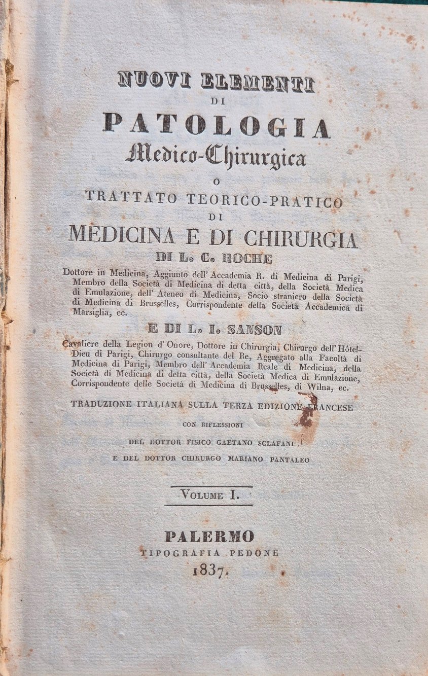 Traduzione italiana sulla terza edizione francese con riflessioni del dottor fisico Gaetano Sclafani e del dottor chirurgo Mariano Pantaleo - in 8° - pp.388; 579; 548; 503 - Tela con titolo in oro al dorso - Quattro volumi in due tomi - Strappetti senza mancanze ai dorsi, fioriture sparse
