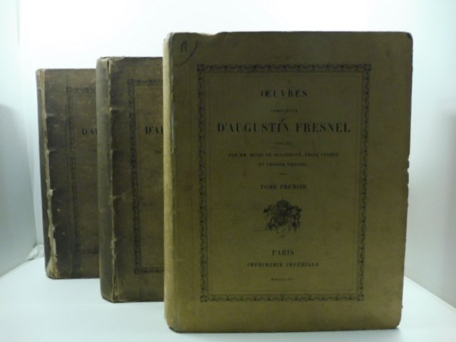 3 voll. in 4, pp. (4) + XCIX + 804 + (2); (4) + 864 + (2); (4) + LXXV + 752 con 1 ritr. all'antip. e 19 tavv. f. t. alcune piu' volte rip. Intonso. Diffusa ed uniforme brunitura. Cart. ed. integra ma con segni d'uso e qualche manc. ai bordi. Edizione originale che raccoglie pressoche' tutte le opere del grande fisico. La prima parte dell'opera compresa nei primi due voll. e' dedicata agli studi di fisica pura e principalmente ai lavori sulla teoria della luce. La seconda parte, contenuta nel 3o tomo, contiene molti lavori di carattere piu' tecnico, in particolare dedicati alla realizzazione di fari. La maggior parte dei lavori di Fresnel era stata pubblicata su riviste di conseguenza, l'edizione di questa monumentale opera, permise di diffondere la conoscenza di questi studi basilari. Di grande importanza per le sue scoperte in campo fisico, fu la realizzazione di particolari integrali, detti appunto di Fresnel, grazie ai quali fu possibile studiare rifessione, rifrazione, interferenza e diffrazione