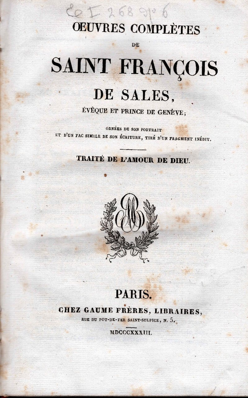 Oeuvres complètes de Saint François de Sales, evêque et prince de Genève. Traité de l'amour de Dieu. Ornées de son portrait et d'un fac similé de son écriture tiré d'un fragment inédit