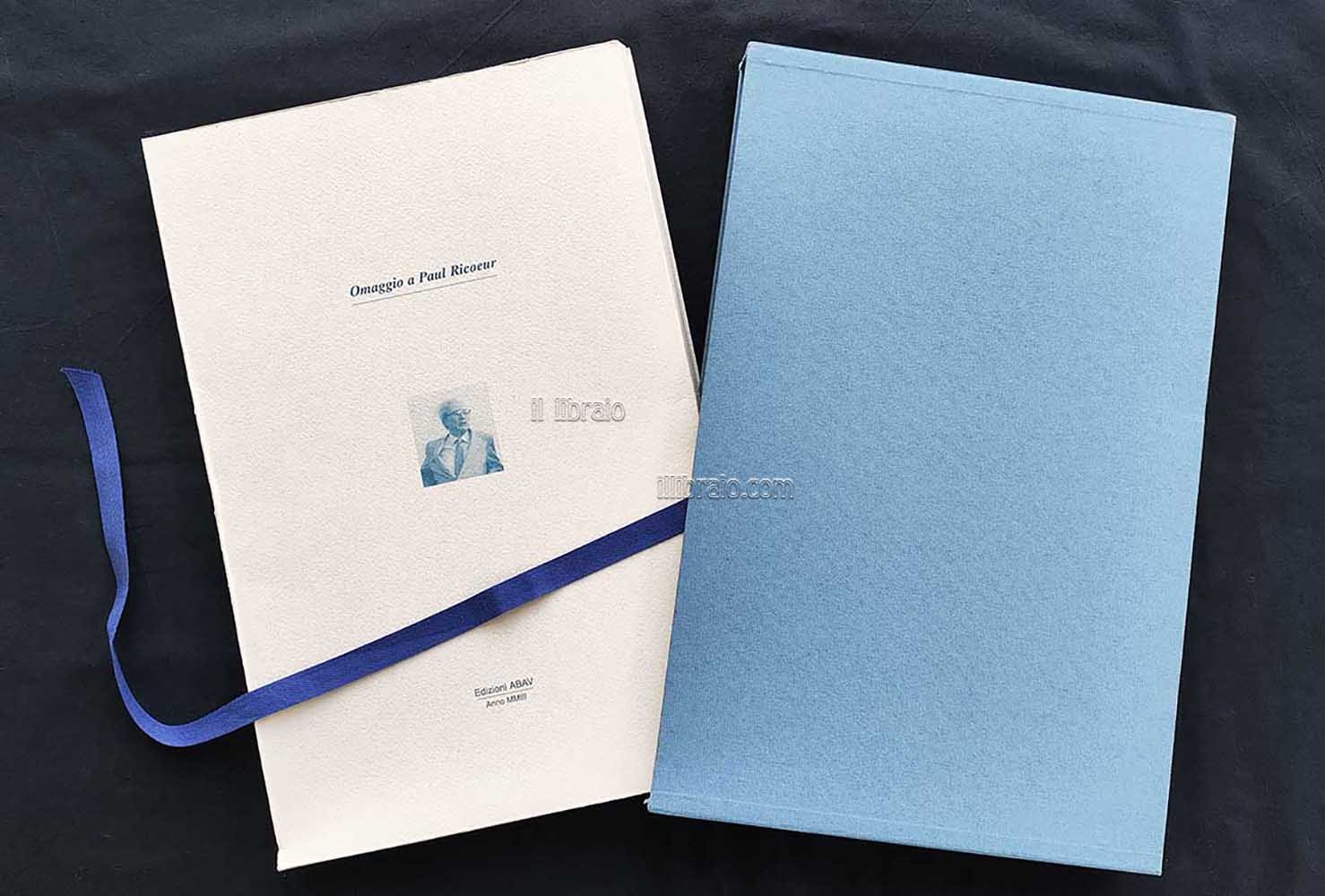 in folio; pp. 36 + 7 tavv. (ill. in bn.); br. con astuccio. Testo italiano - francese. Tiratura di 90 esemplari numerati (ns. 40) *esemplare con autografi di Ricoeur e Zanzotto. Opera in omaggio al filosofo francese Paul Ricoeur per iniziativa dell'ABAV (Accademia di Belle Arti Lorenzo da Viterbo) e con il patrocinio della Camera dei Deputati. La cartella raccoglie fogli sciolti ed è composta da testi dello stesso Paul Ricoeur e Osvaldo Rossi. Presentazione di Luigi Sepiacci. Poesie Yves Bonnefoy (Quel che fu senza luce - 1987) e Andrea Zanzotto (Tre inediti 2000 - 2002). Inoltre contiene 7 incisioni di: L. Bruno, B. Ceccobelli, L. Ceschin, O. Galliani, V. Manno. L. M. Patella e A. Woda