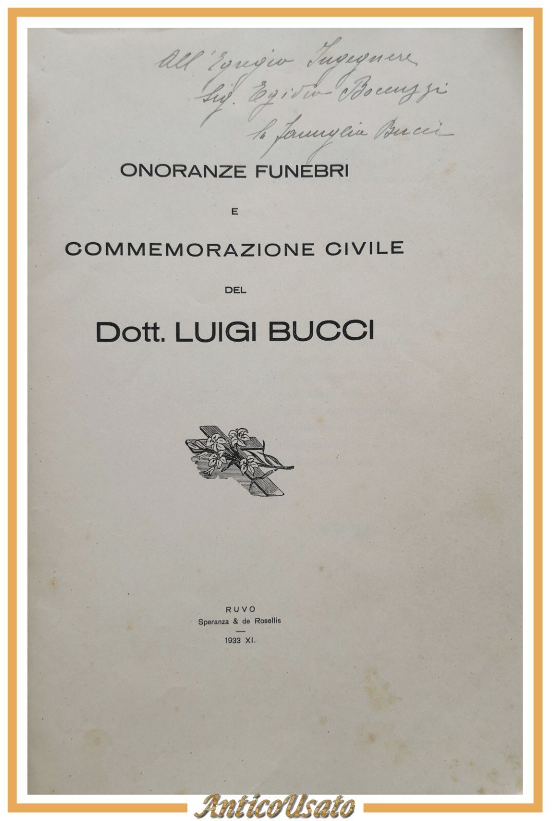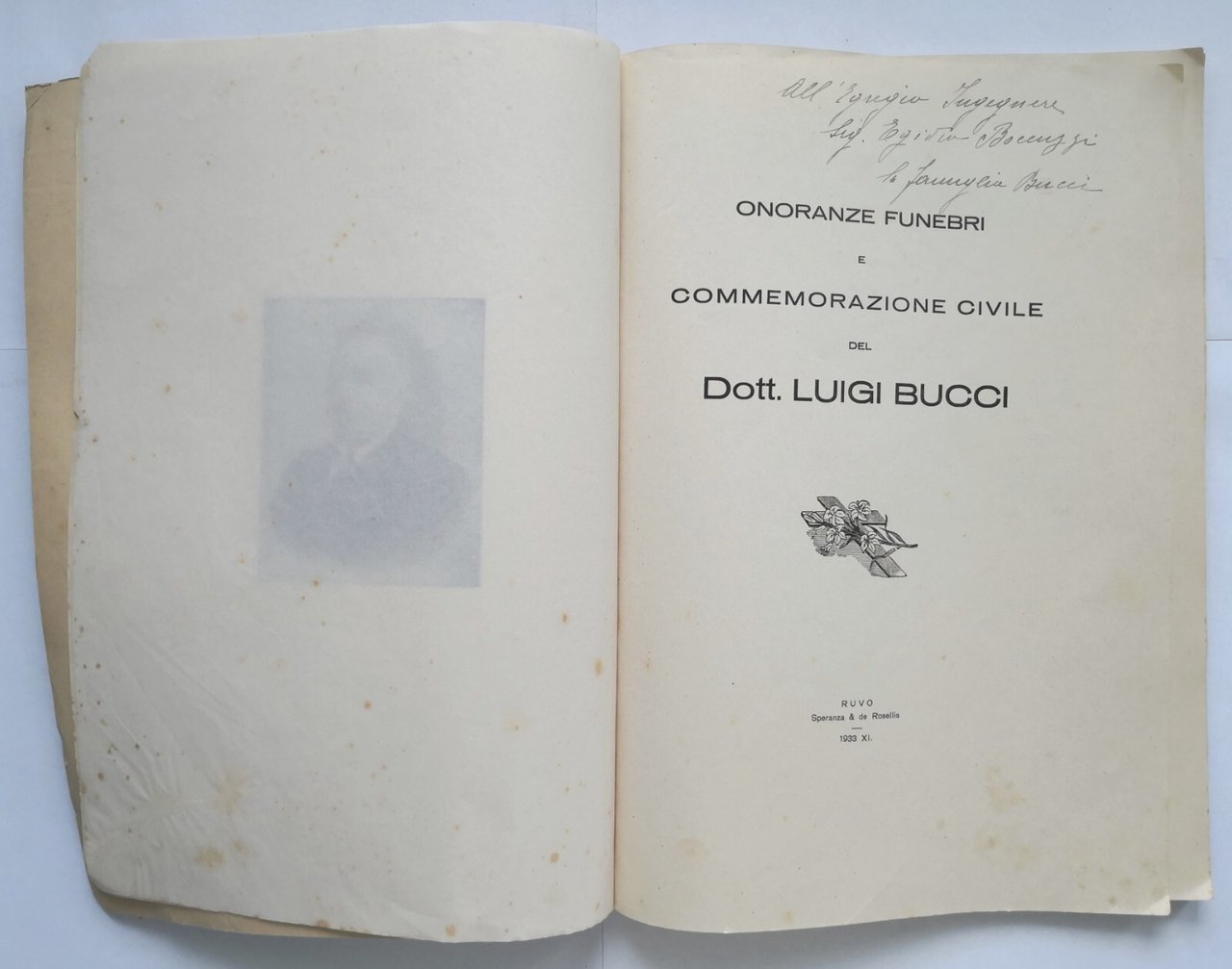 ONORANZE FUNEBRI E COMMEMORAZIONE CIVILE DEL DOTTOR LUIGI BUCCI Ruvo 1933 Libro