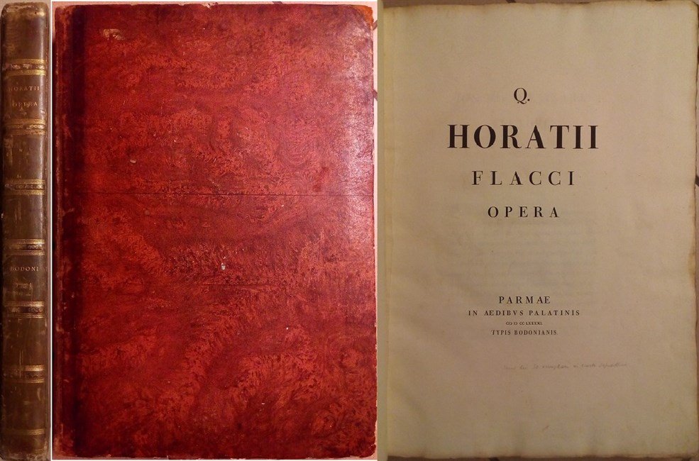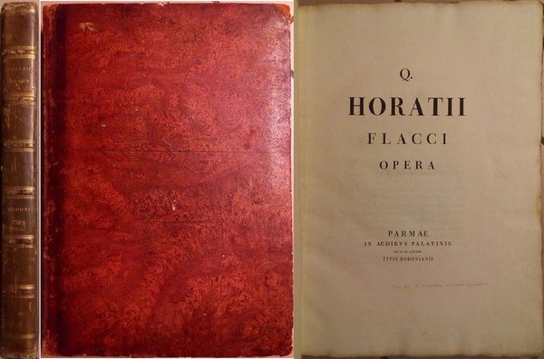 in folio, pp. (4), 14, 371, leg. m. pelle con tit. oro al d., piatti in carta dec. Risguardi in carta dec. Brooks 417: “Questo è il primo de’ classici che Bodoni stampò coi suoi torchi privati”. Sulla prima carta bianca alcune antiche note mss ad inchiostro dichiarano essere una delle 50 copie su carta sopraffina. Un lieviss. alone al margine sup. bianco delle ultime 3 cc e lievi tracce di usura alla carta della leg., ma ottimo esempl. in solida legatura.