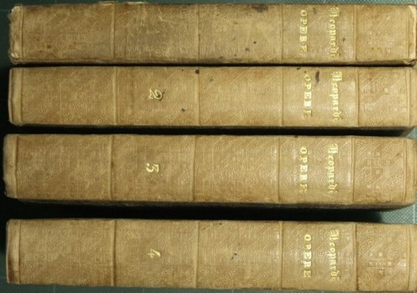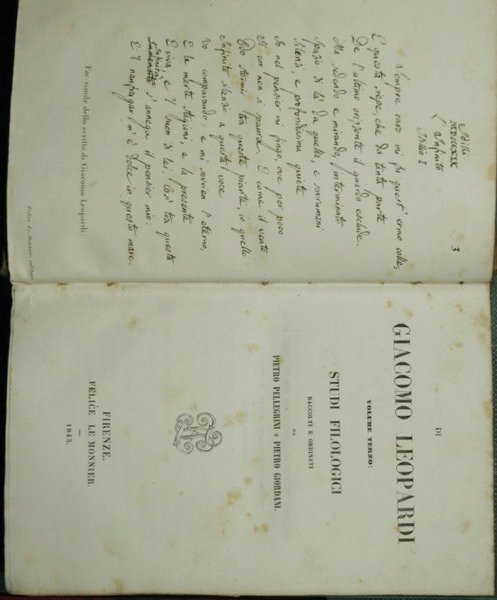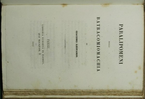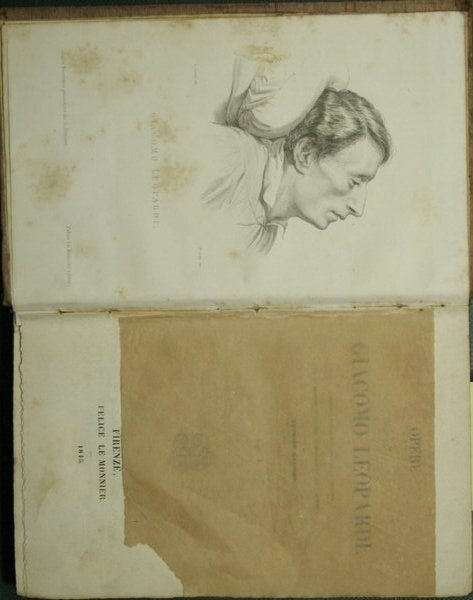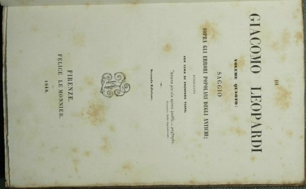 Vol. I e II: Opere; Vol. III: Studi filologici raccolti e ordinati da Pietro Pellegrini e Pietro Giordani; Vol. IV: Saggio sopra gli errori popolari degli antichi pubblicato per cura di Prospero Viani; Paralipomeni della Batracomiomachia - Edizione accresciuta, ordinata e corretta secondo l'ultimo intendimento dell'autore da Antonio Ranieri - in 16° - pp.XXXII + 317; 363; XXIX + 484; XIX + 312 + 136 - Tela con titolo in oro al dorso - Cinque volumi in quattro tomi - Tavole incise da Livy e Lasinioin antiporta ai primi due voll. protette da velina, fac-simile del manoscritto de 'L'infinito' in antiporta al terzo vol. - Prima edizione completa in cui appaiono per la prima volta 'Il tramonto della luna' e 'La ginestra' - Ex libris incollato al foglio di guardia di ogni vol. - Paralipomeni della Batracomiomachia, Parigi, Libreria europea di Baudry, 1842. Dai torchj della signora Lacombe