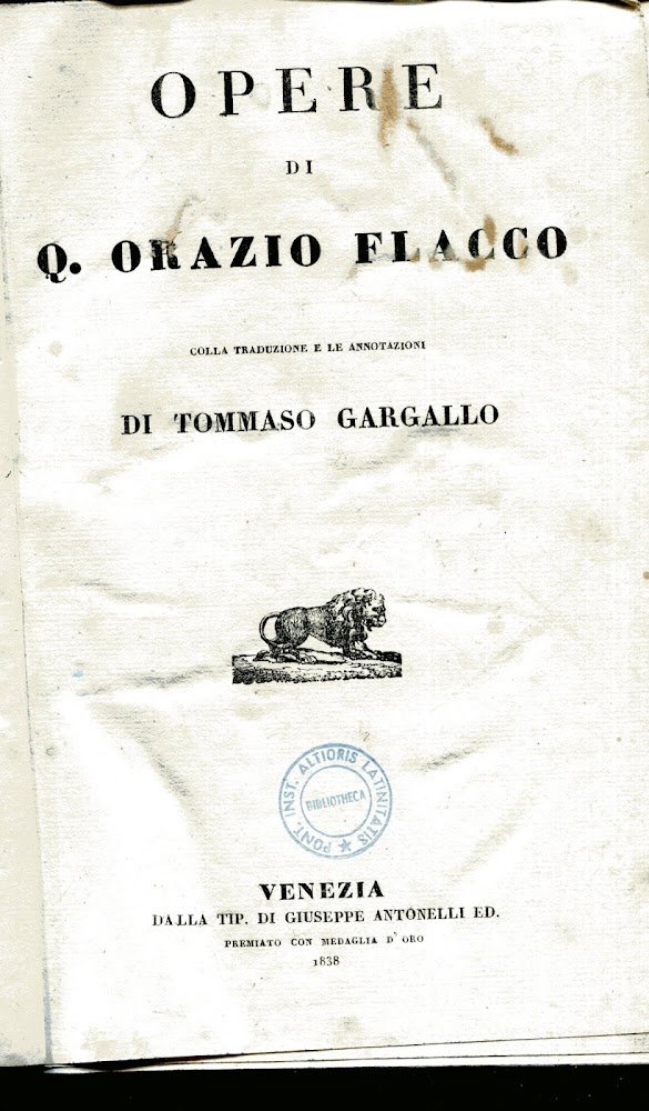 Opere di Q. Orazio Flacco colla traduzione e le annotazioni di Tommaso Gargallo. Unito insieme a: A. Persio Flacco, Vita, Introduzione e Satire, (manca il frontespizio); D. Giunio Giovenale, Vita, Nicolai Rigaltii De satira Juvenalis Dissertatio, (manca il frontespizio)
