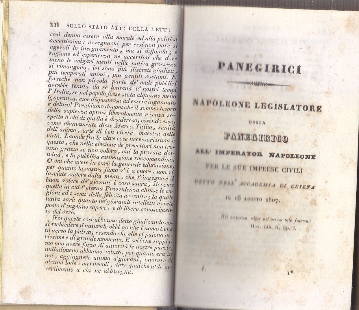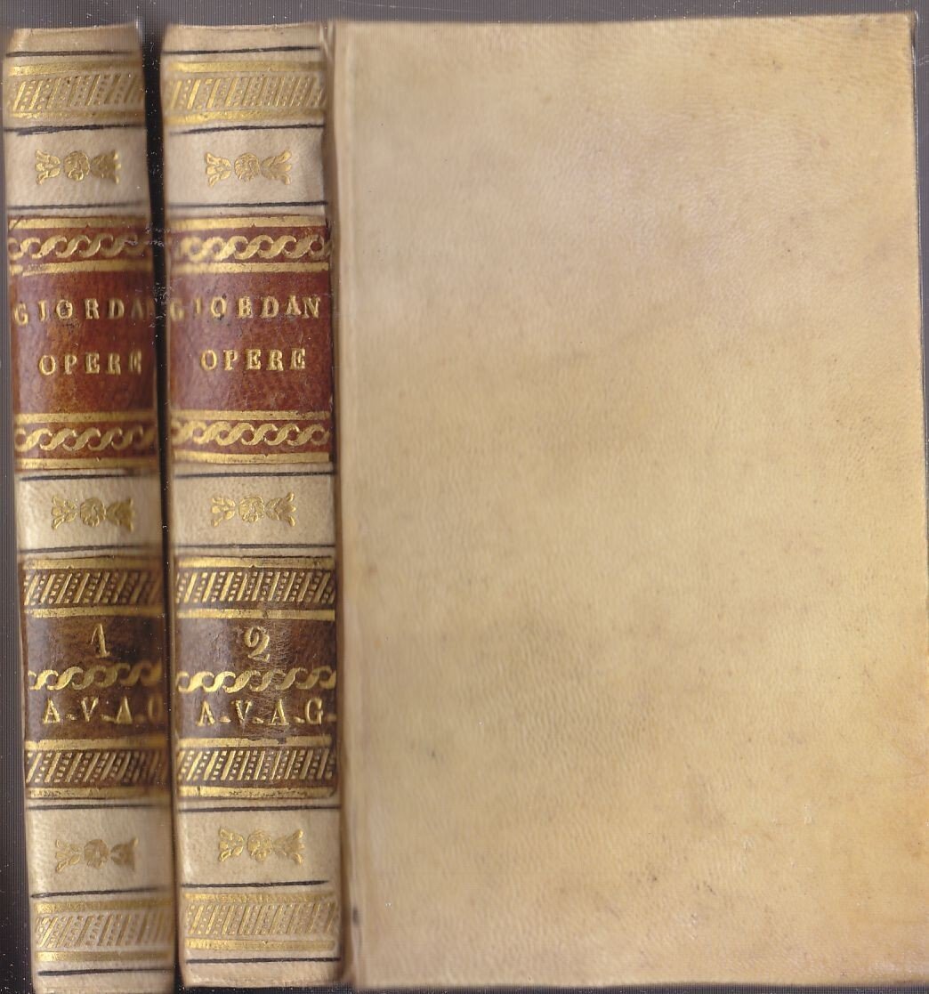 XII, 264 + 312 pagine. Copertina ottocentesca in tutta pelle con titoli e fregi dorati entro tasselli colorati al dorso , tagli picchiettati e segnalibro in seta verde. Dimensioni: 9 x 14 cm. stato di conservazione: molto buono (fioriture, per il resto esemplari in ottime condizioni)Rara edizione stampata a Ginevra dal Brighenti dopo quella stampata in Italia nel 1824, che comprende "intorno allo stato attuale della letteratura in Italia" discorso di Giovanni Marchetti e soprattutto le opere del Giordani censurate in Toscana, tra cui il Panegirico a Napoleone.