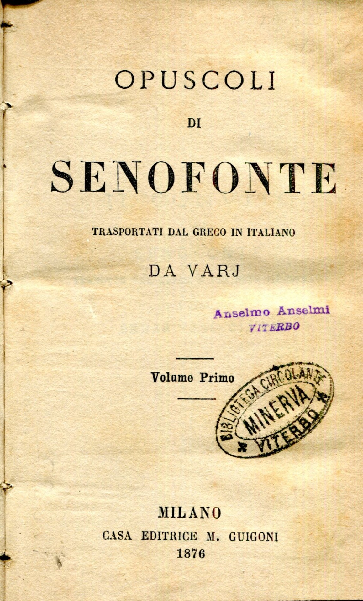 In 16, pp. 253, 219. Rilegatura coeva mezza pergamena muta. Timbri di biblioteca e di possesso sul frontespizio, volume dismesso. Lievissime bruniture alle carte. Dall'Indice: L'economo; Dell'arte di cavalcare; Il cinegitico ossia intorno alla caccia; Del carico del Generale di Cavalleria; Epistole Buono (Good) .