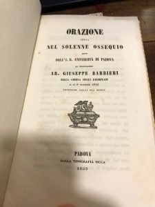 ORAZIONE LETTA NEL SOLENNE OSSEQUIO RESO DALL’I. R. UNIVERSITA’ DI PADOVA AL PROFESSORE AB. GIUSEPPE BARBIERI NELLA CHIESA DEGLI EREMITANI IL DI’ 9 DICEMBRE 1852, TRIGESIMO DELLA SUA MORTE