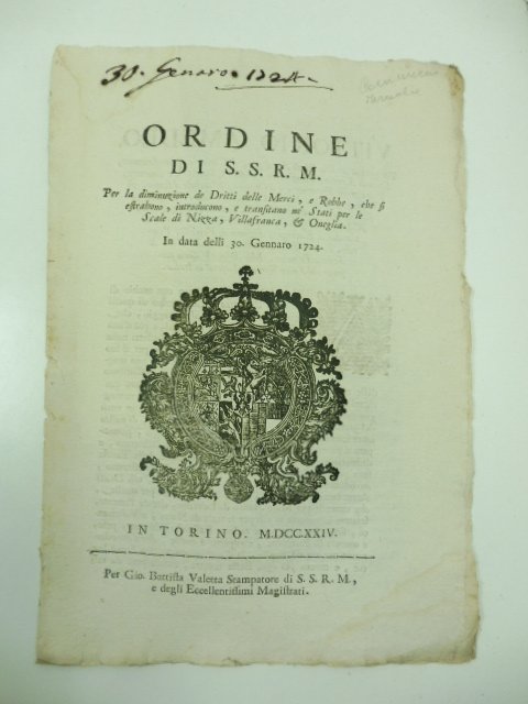 In 4, pp. (4). Data anticamente manoscritta al front. Qualche lieve mancanza al marg. int. delle cc. Ordine recante la notizia di una diminuzione delle tariffe sul transito delle merci in particolare per quelle che 'venendo per mare tanto da Levante che da Ponente saranno introdotte in essi per le scale di Nizza e Villafranca.'. La dimunuzione delle tariffe riguarda anche le merci provenienti da Oneglia.