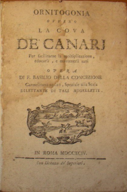 in-16, pp. 70, rileg. post. cartone rigido. Fregio xilogr. al front. Rarissimo trattato, censito in sole 3 biblioteche italiane, sull'origine dei canarini, allevamento, cura, nutrizione, malattie e cure. L'A. (1727-1804) fu il frate carmelitano Basilio, botanico e speziale della più antica farmacia romana di S. Maria della Scala in Trastevere, la "farmacia dei Papi", dove è conservato un suo prezioso erbario. La prima edizione uscì nel 1759 dove l'A. si cela sotto lo pseudonimo di Farmacopio Ornithogrofago, solo in questa edizione compare per la prima volta il nome di Fra Basilio. Ceresoli p. 75. Lieve gora. Raro. [403]